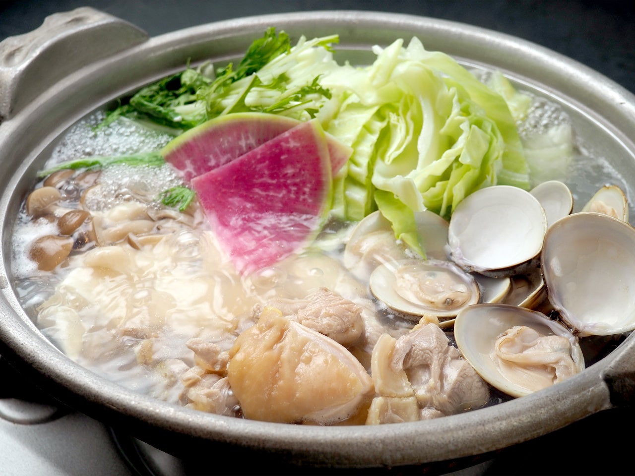福岡県産の野菜と、はかた地どりを水炊きに。本場の味わいにはまぐりの旨みが加わった贅沢な一品です。