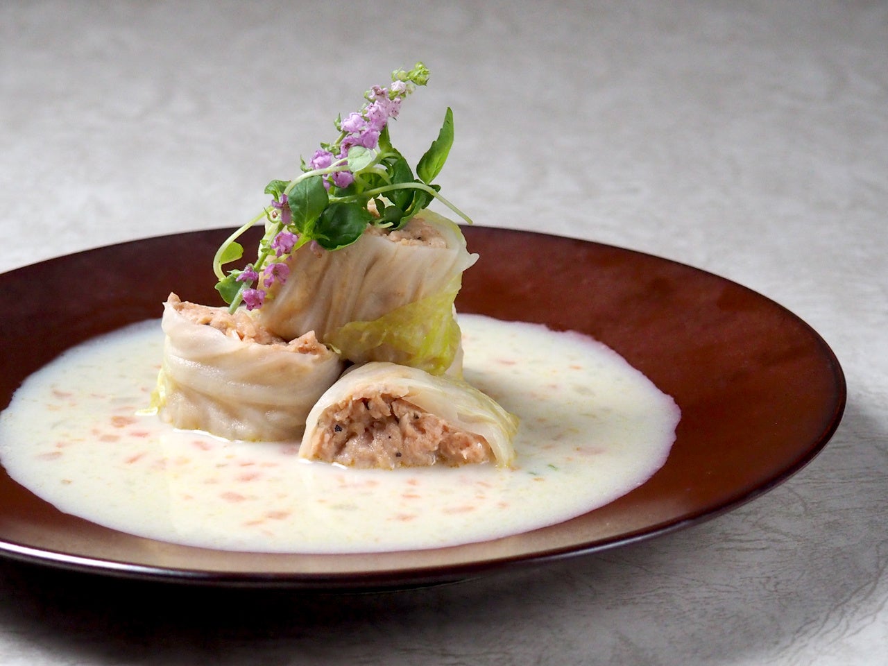 ・はかた地どりのロールキャベツ ポルチーニ茸香る豆乳クリームソース ¥2,200(税込)