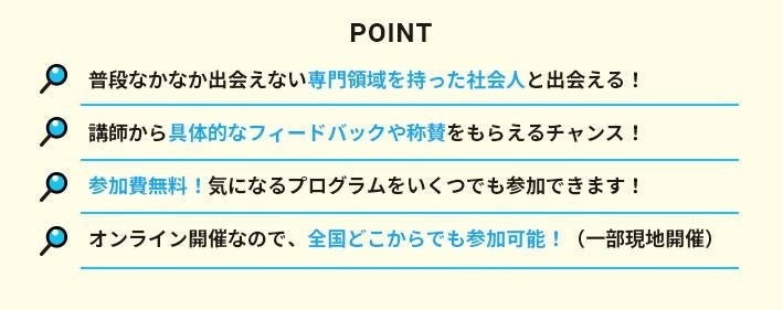 学習指導要領の改定で2022年度から高校で必修となった「総合的な探究の時間」で必要な①探究力を高める、②社会とつながってみる、③探究を進路につなげる、という3つの目的に応じた7つのプログラムを用意しました。地域探究や社会課題を主なテーマに、専門領域をもった社会人や地域で活躍する人が登壇します。受講した生徒には後日、講師のコメントが入った「修了証」をお渡しする予定です。