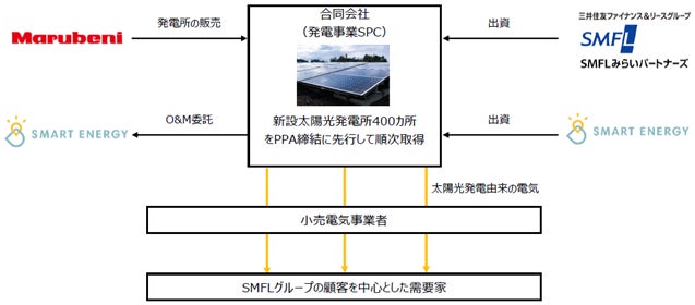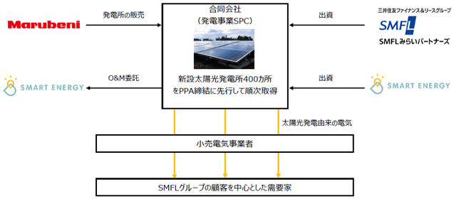 共同3社は、脱炭素社会の実現に貢献するために、追加性※2のある再生可能エネルギーの早期導入を目指し、Non-FIT低圧太陽光発電所に関する協議を重ねてきました。今般、SMFLみらいパートナーズとスマートエナジーは共同出資により合同会社を設立し、2024年度中に丸紅から低圧太陽光発電所400カ所(直流容量換算約40MW)を取得します。本件スキームの組成支援を行ったスマートエナジーが取得した発電所の保守・管理(O&M)とアセットマネジメントを担い、SMFLグループの顧客基盤を強みとして活用することで、合同会社は国内の需要家に対して追加性のある再生可能エネルギーをコーポレートPPA※3で提供していく予定です。