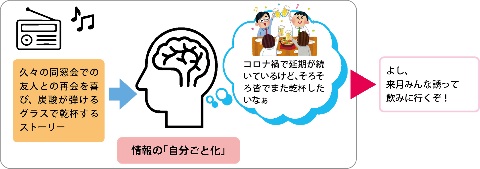 例えば、清涼飲料水関連では、その商品が使用されているシーンを描いた音声広告として、「部活帰りに同級生と炭酸飲料を飲みながら他愛もない話をして家に帰ったシーン」が描かれると、広告聴取者は自分の過去の「学校帰りに友達と駅まで一緒に歩いた経験やその時の感情など」をイメージして、情報が自分ごと化され、記憶に残りやすく、商品選択に繋がっていくと考えられます。