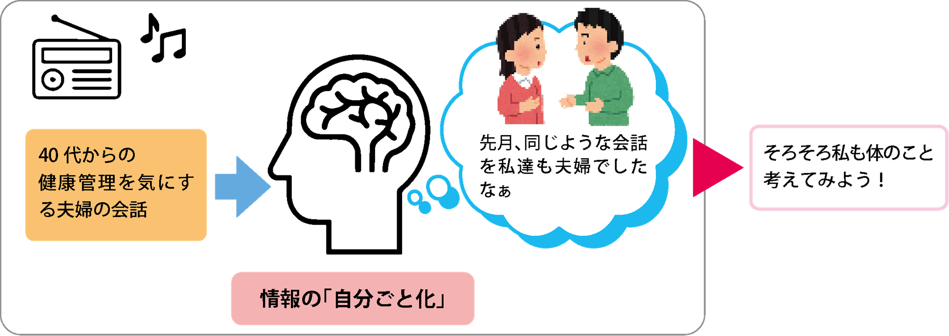 音声広告は、「広告のストーリーや内容」と一体化した商品情報が、「自分に向けられた情報」「自分に合った情報」として「自分ごと化」されて記憶に残ることで、商品・サービスの選択・購買が期待されます。ここからはradikoが考える音声広告の特性を活かした、具体的なアプローチ例をご紹介します。