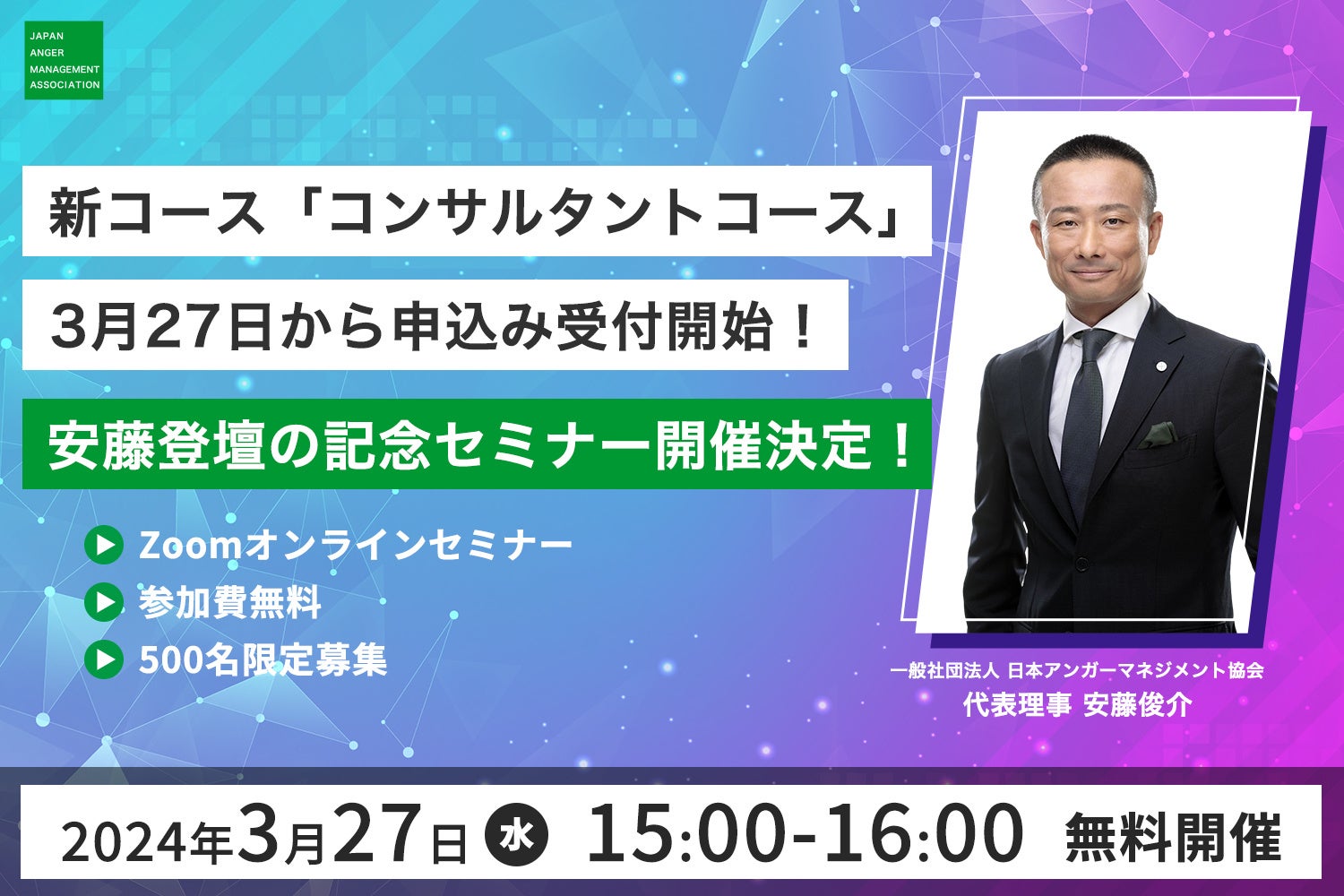 協会初!本場「アメリカ講座」と同レベルのコンサルティング開業資格のアンガーマネジメントと基礎編がコースで受講可能に。3/27当会代表の安藤登壇の「コンサルタントコース」開講記念セミナーも開催!!
