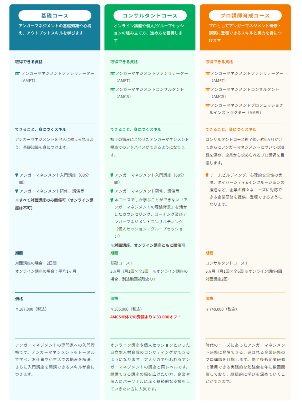 その後、アンガーマネジメントコンサルタント(AMCS)、さらに学びを深めたい方にはアンガーマネジメントプロフェッショナルインストラクター(AMPI)の順に取得していただくことができます。