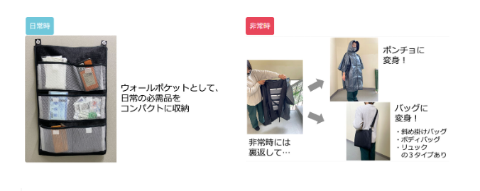 「魔法のポケット」は、日常時はウォールポケットとして生活に必要な物を入れて使うことができ、災害時にはリュックにして持ち運んだり、防水防寒のポンチョとして使用することができる、フェーズフリー(※)な3in1の便利グッズです。