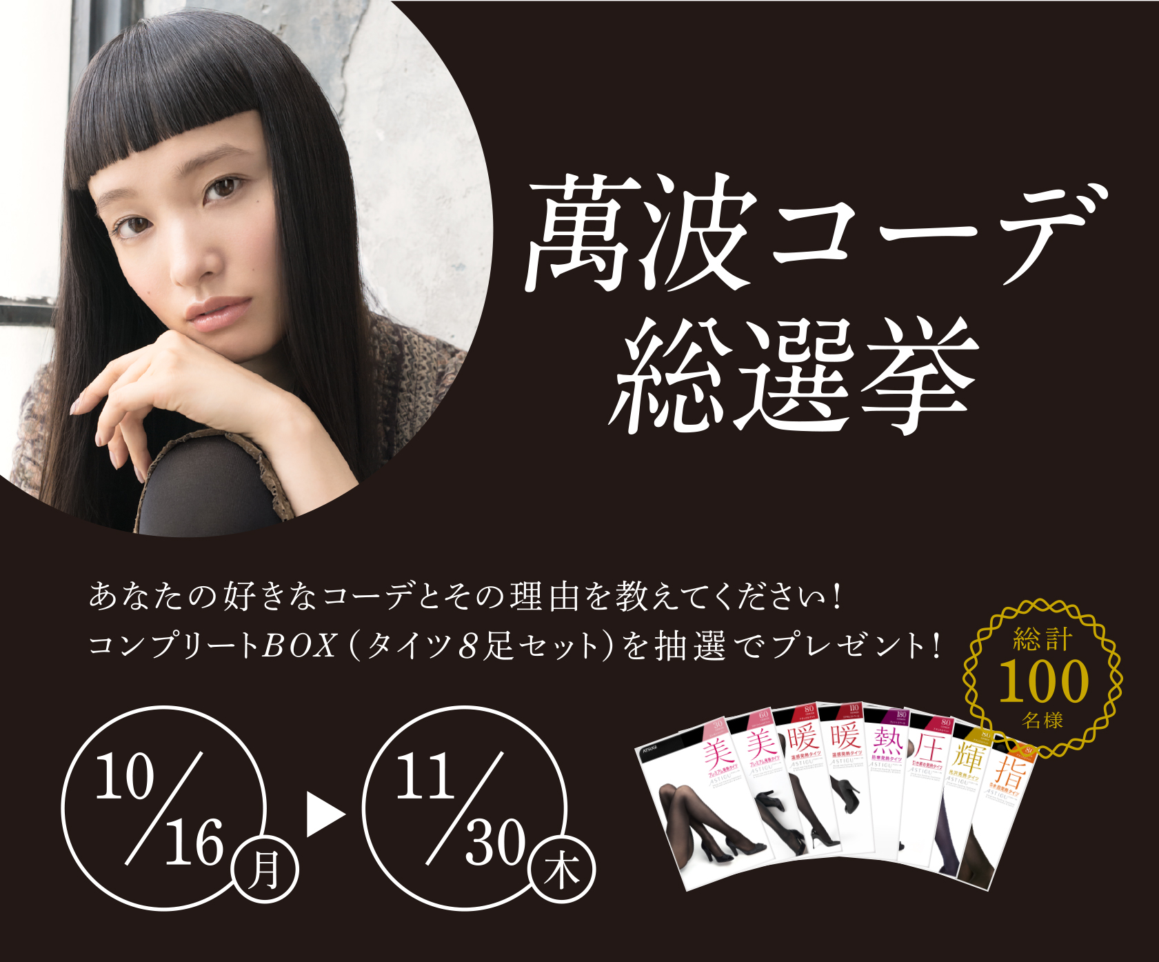 「萬波コーデ総選挙」10月16日からスタート!アスティーグコンプリートBOX(タイツ8足セット)が、期間中100名様に当たる!