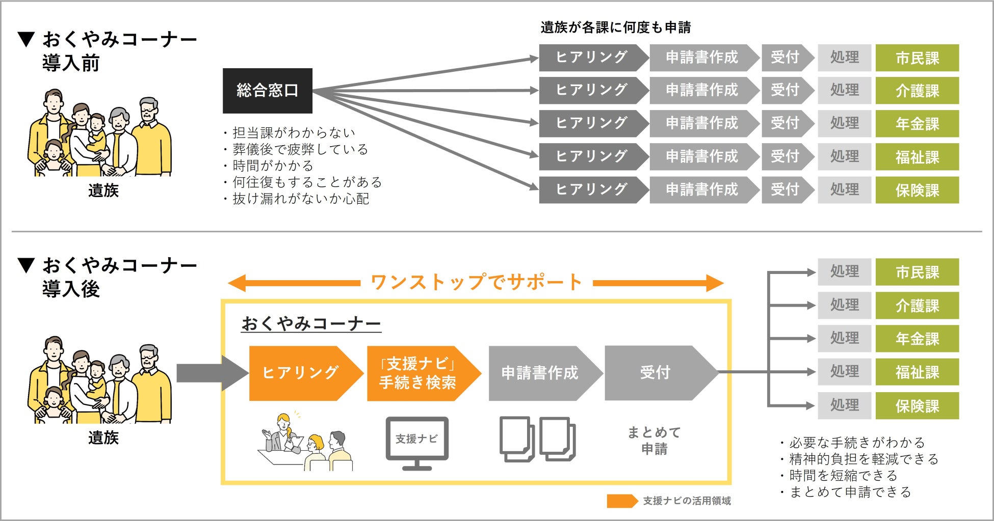 「担当課がわからない」「葬儀後で疲弊している」などの遺族の負担を軽減