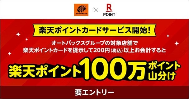 キャンペーンにエントリーのうえ、「オートバックスグループ」の対象店舗で「楽天ポイントカード」もしくは「楽天ポイントカード」機能が搭載されたアプリ、または「楽天カード」裏面のバーコードを提示して200円(税込)以上の会計をした方に、「楽天ポイント」100万ポイントを山分けで進呈します。 |