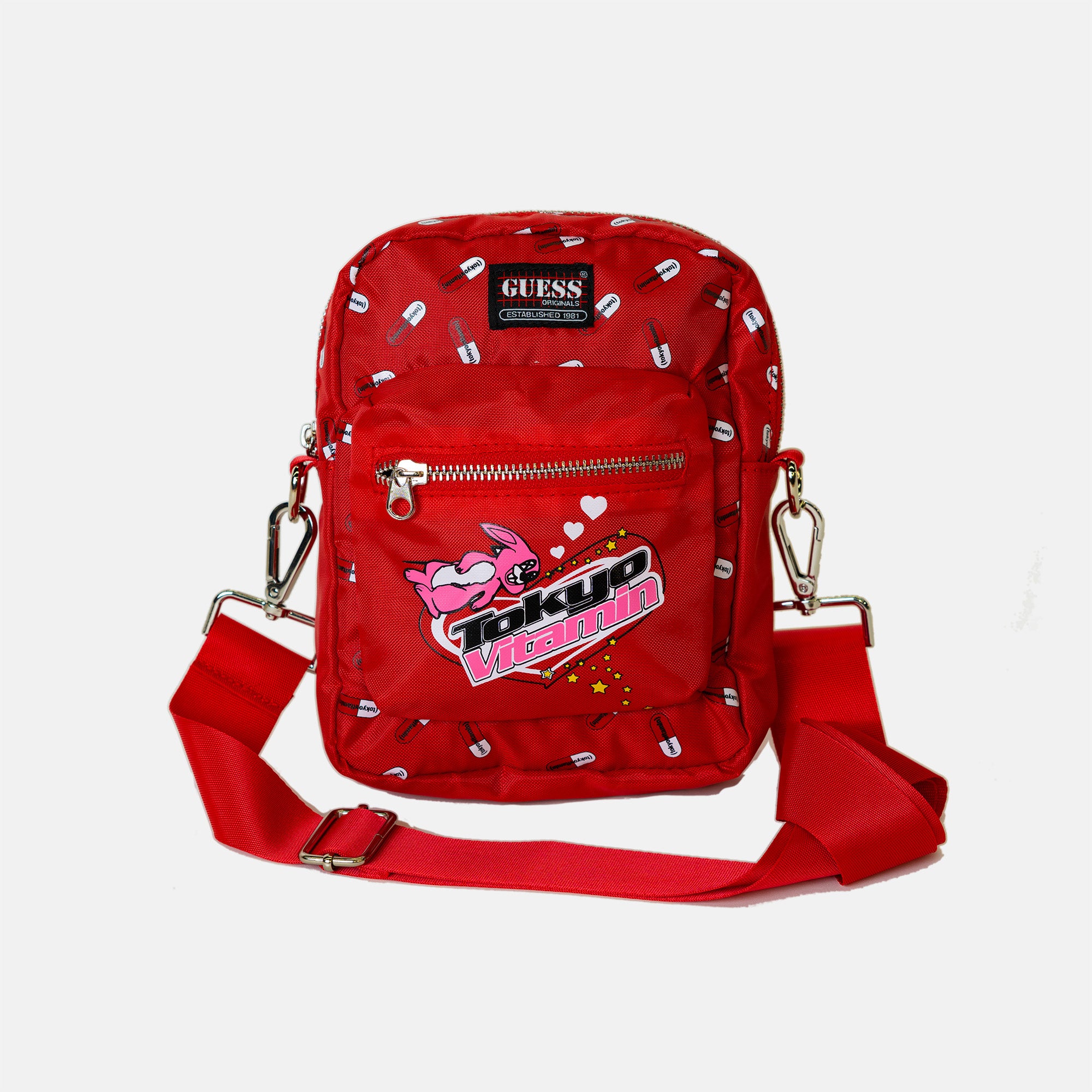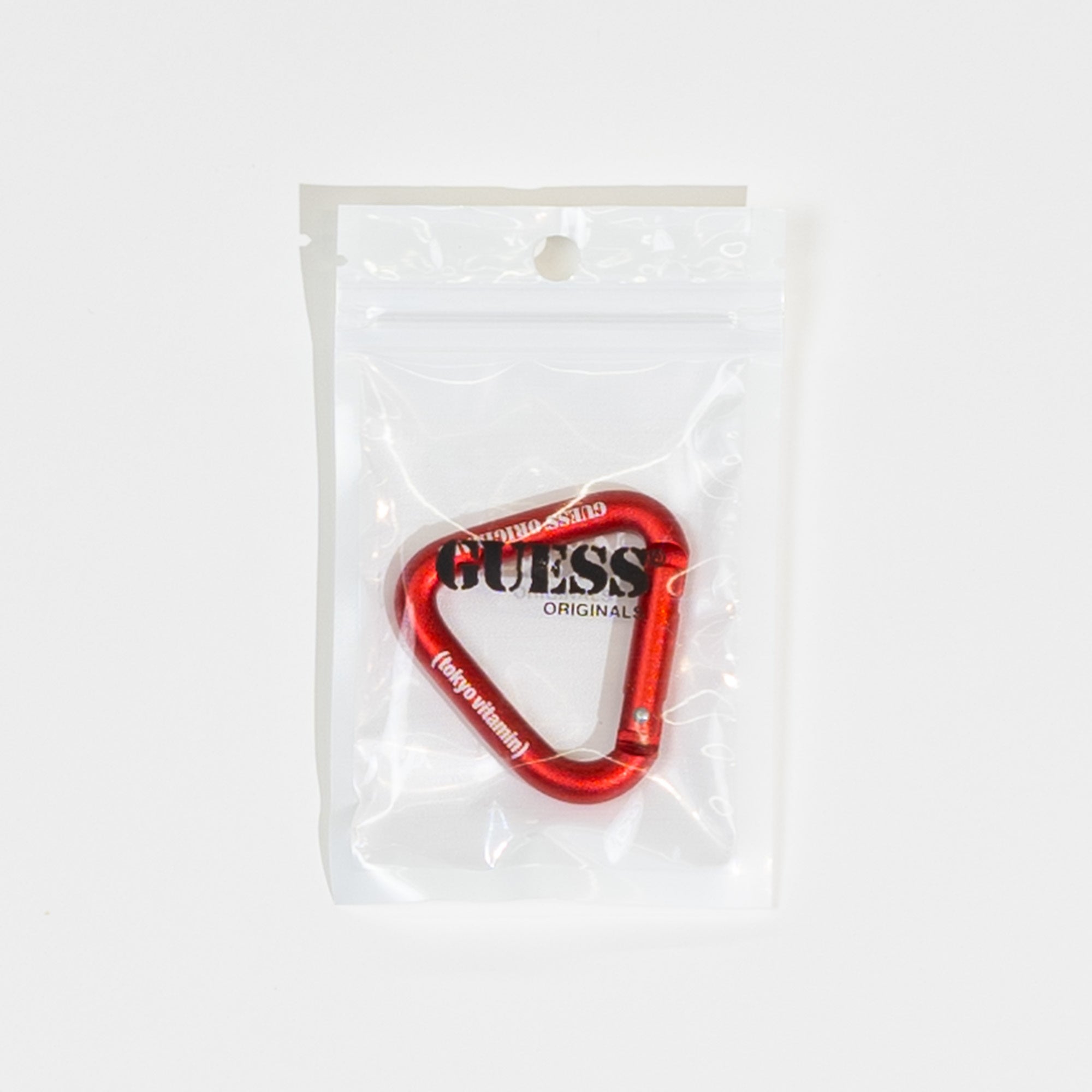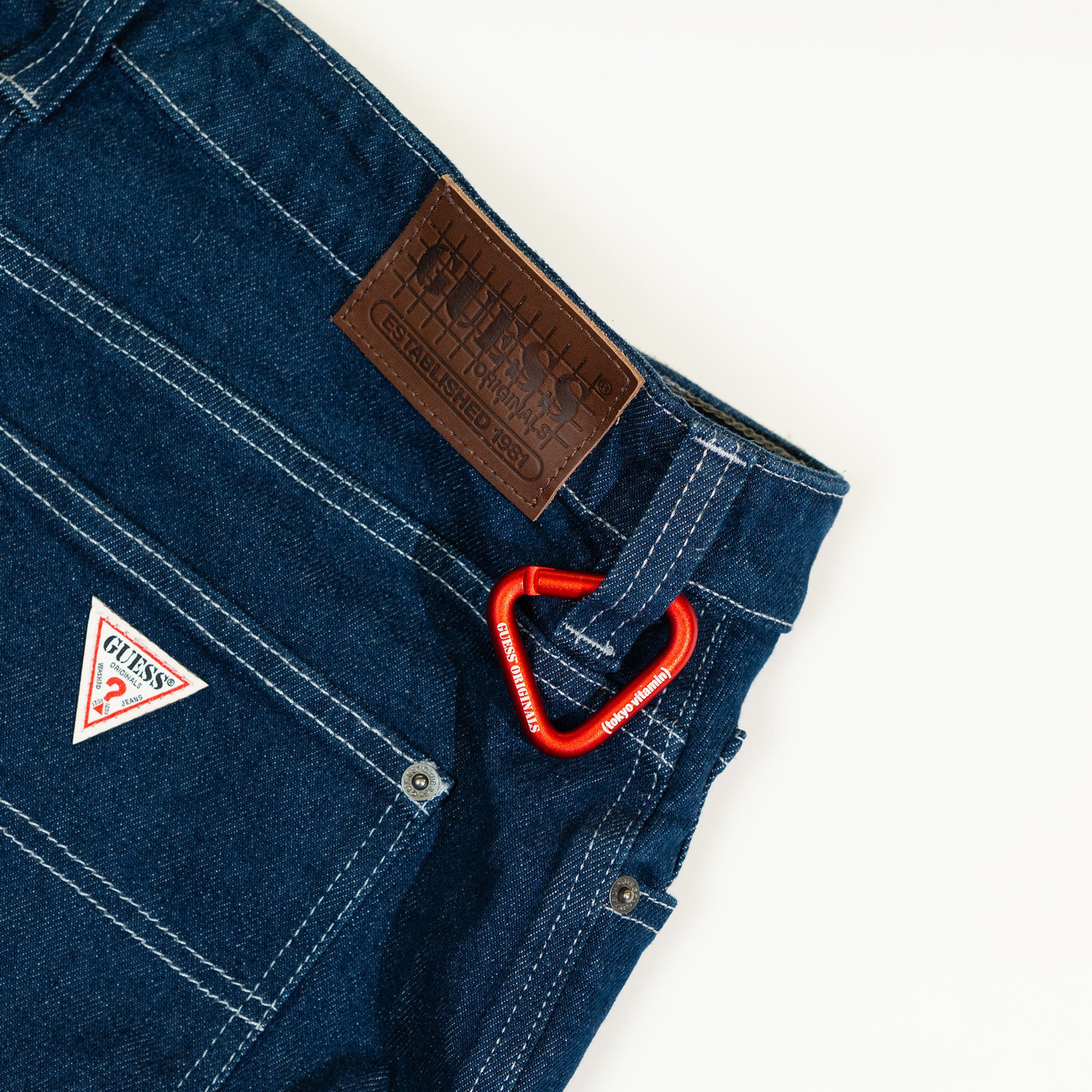 このPOP-UP STOREでは、コラボレーション限定商品として、コラボロゴを施したTシャツ(メンズサイズ、ウィメンズサイズともに¥6600)とミニバッグ(¥7700)、ステッカーパック(¥1650)、そしてGUESS Originals定番のカーペンターパンツを販売いたします。カーペンターパンツをご購入の者の方には、GUESS Originalsとtokyovitaminのコラボレーションカラビナをプレゼントいたします。