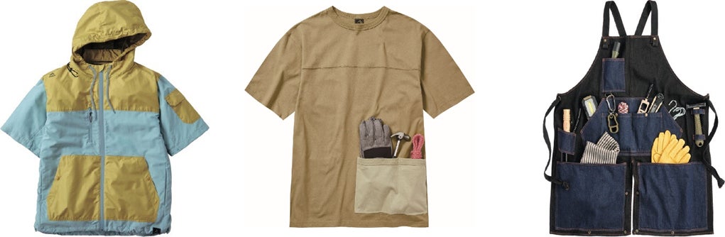 画像右:収納力が満載のアイデアエプロン「コットンキャンパーエプロン」1900円 →3万点販売