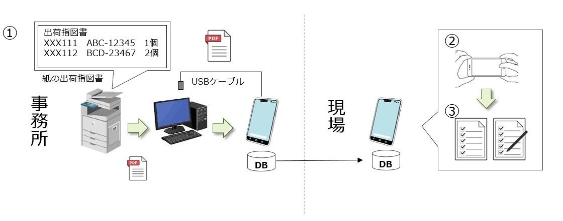 ①紙の出荷指図書を複合機で画像データ化してスマホに取り込む
