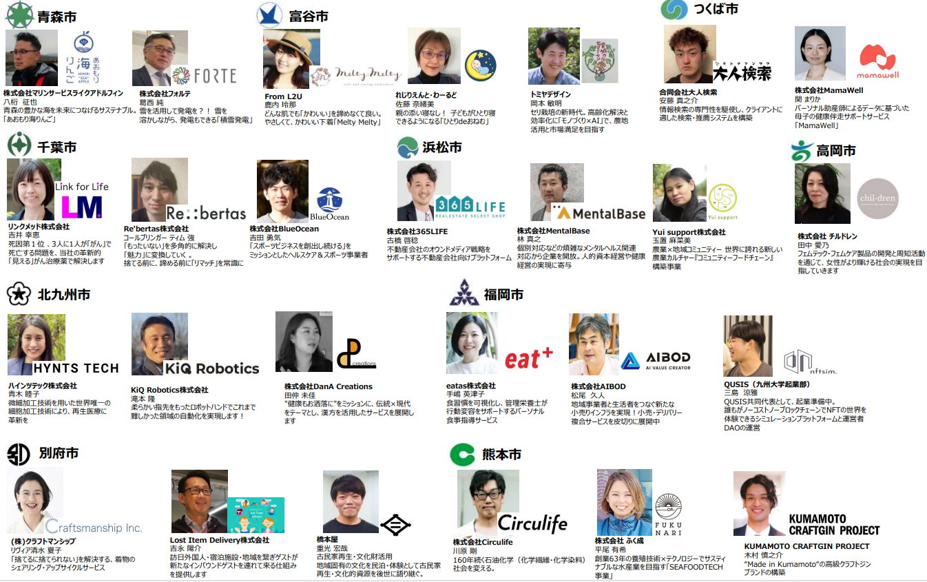 加盟自治体から選抜されたスタートアップ26社によるピッチ(ショートプレゼンテーション)や、23社のブース展示を通じて、首都圏企業を中心とした既存事業との出会いを通じた新たなビジネスを創出することを目的としています。自治体の首長(富谷市、つくば市、高岡市、北九州市、福岡市)によるトークセッションを開催します。皆様、ぜひ奮ってご観覧ください。