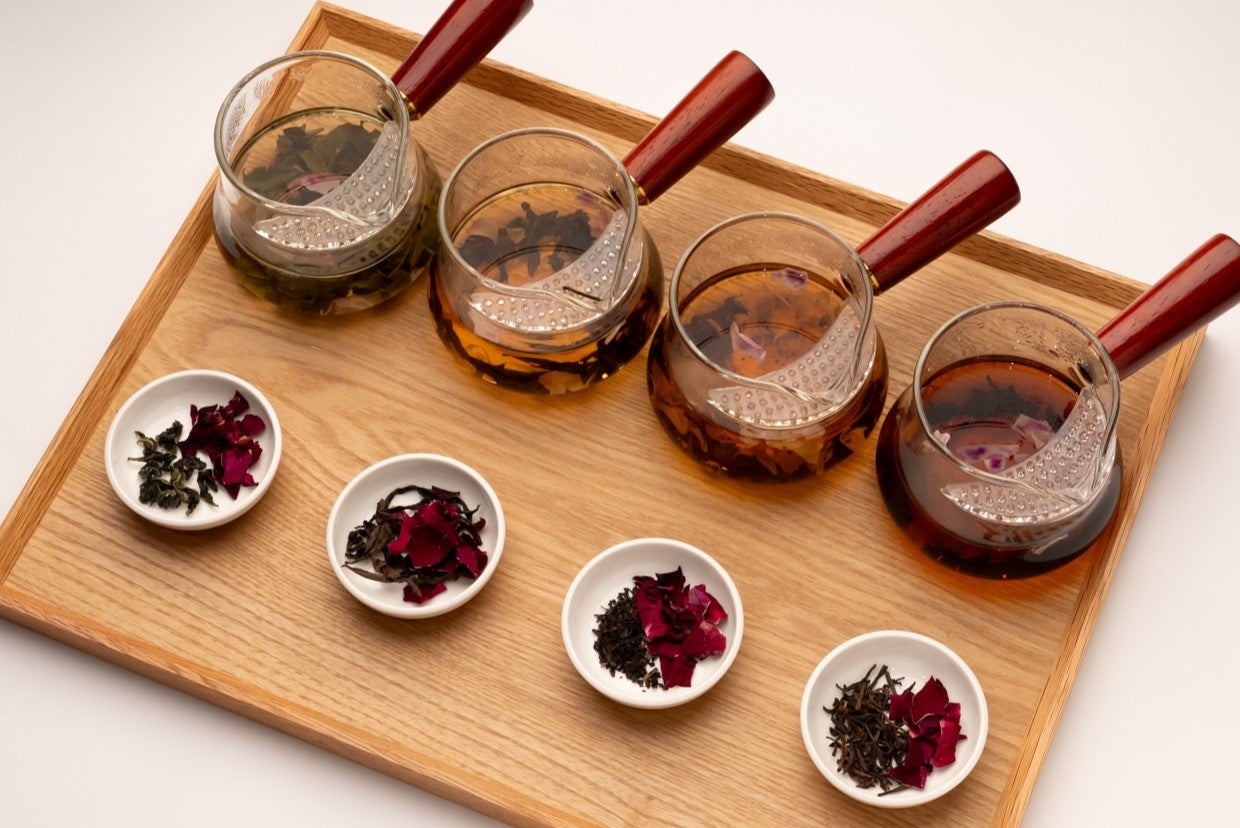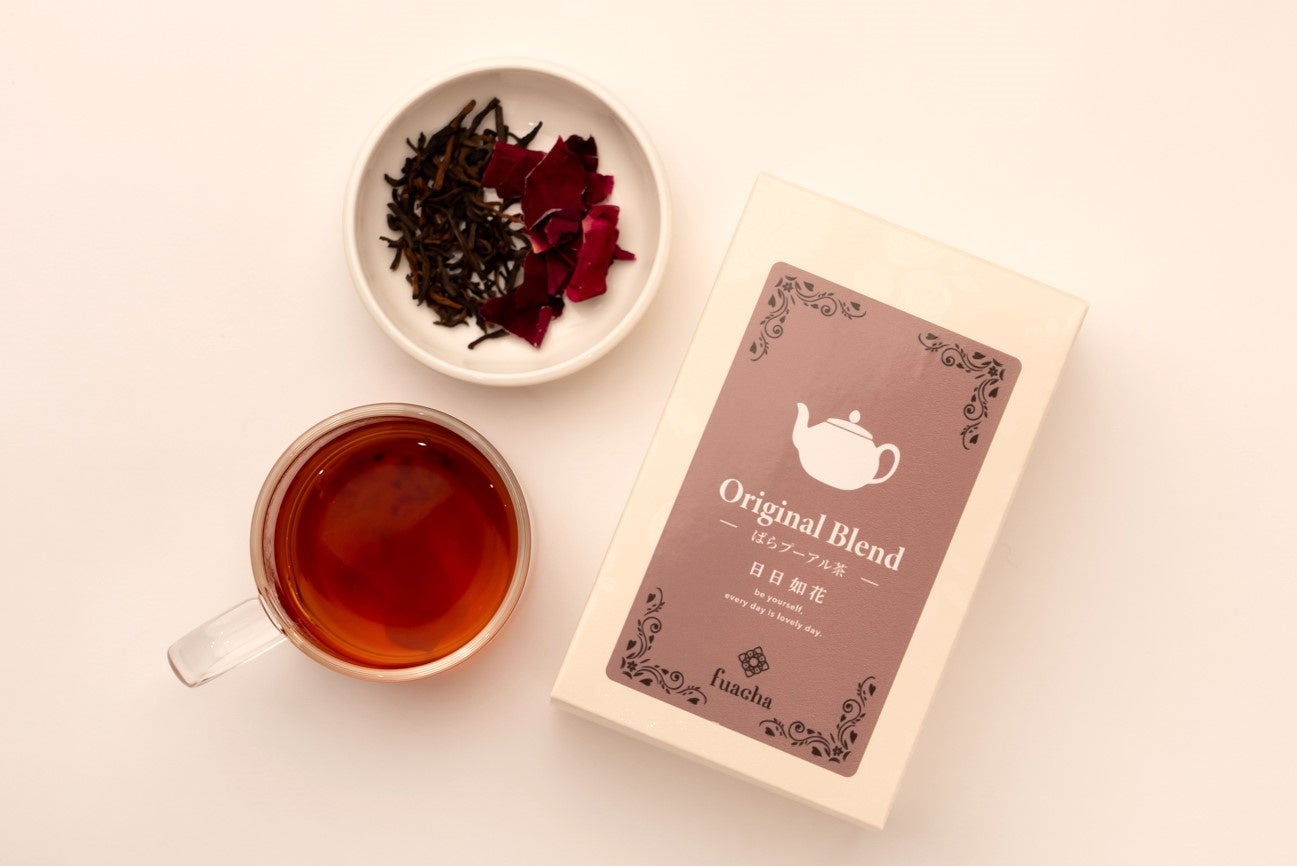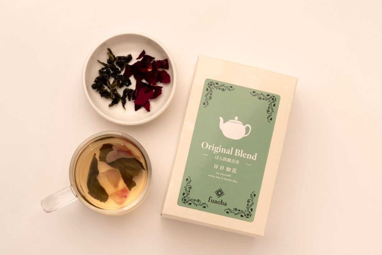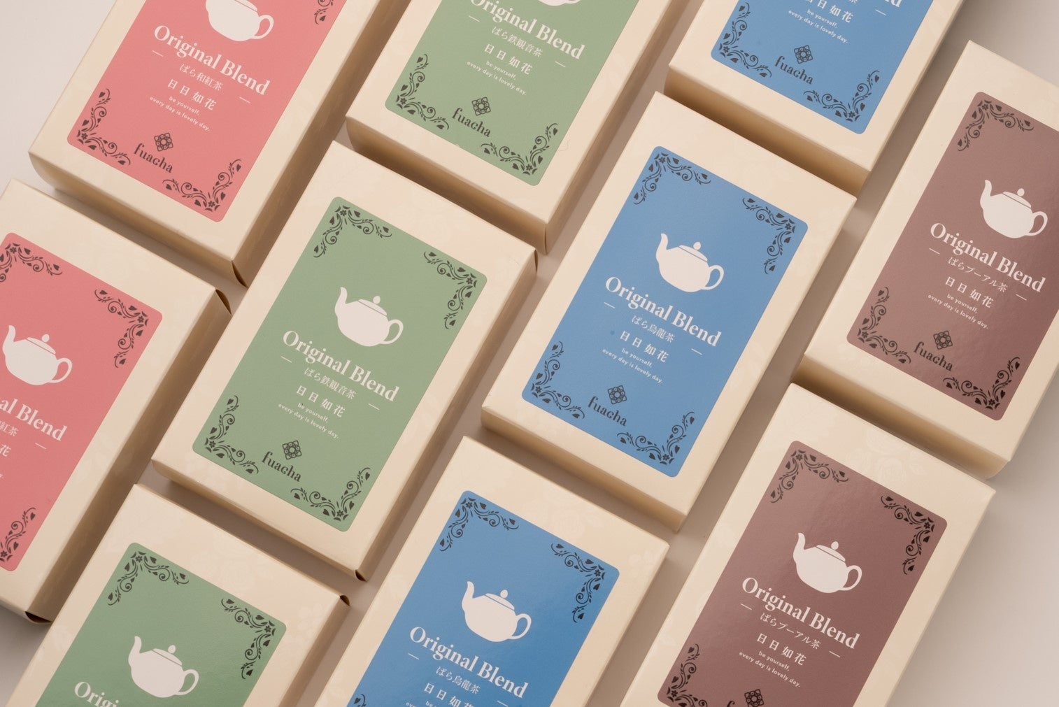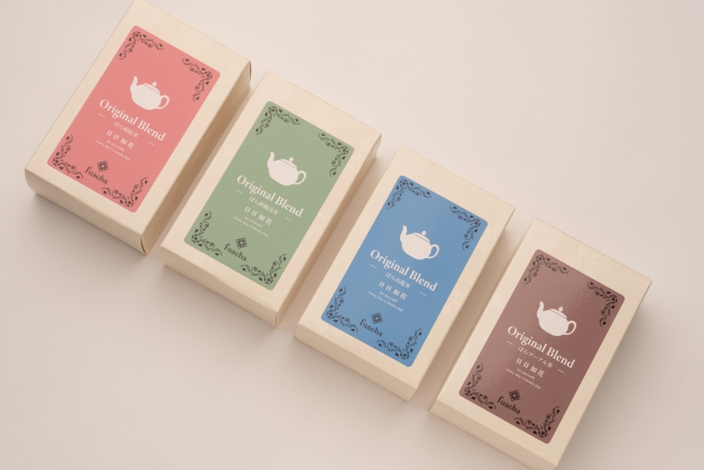 fuacha tea studio(常設店舗)でご好評いただいている、「ばら花冠茶®」と茶葉のブレンド「ばらのブレンドティー」シリーズが新しいパッケージにリニューアル!今回のポップアップストアでも発売します。