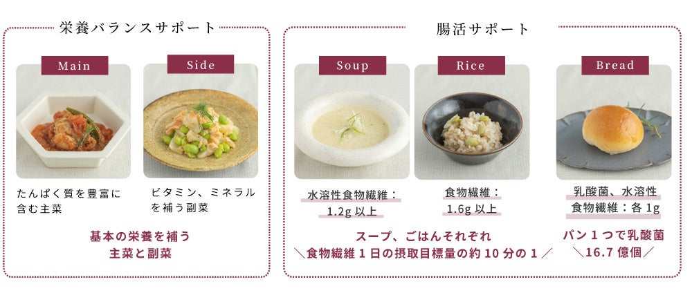 ③主菜と副菜でしっかりと栄養素を補給しつつ、スープ、ご飯、パンで食物繊維を豊富に含んだトータル腸活支援食です。栄養バランスの整った、新たな腸活ダイエットをサポートします!