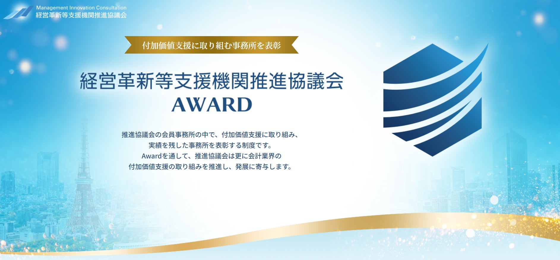 経営革新等支援機関推進協議会に参画している全国1700の会員事務所より、中小企業の発展を目指し、各種補助金支援、融資・資金繰り支援、優遇税制支援の実績を残した事務所を称える賞です。実績とともに、推進協議会の各種サービスの利用をしていることも選出基準のひとつです。推進協議会AWARDという表彰制度のなかの1つであり、毎年推進協議会が主催しているイベント「推進協議会フォーラム」にて発表を行っています。