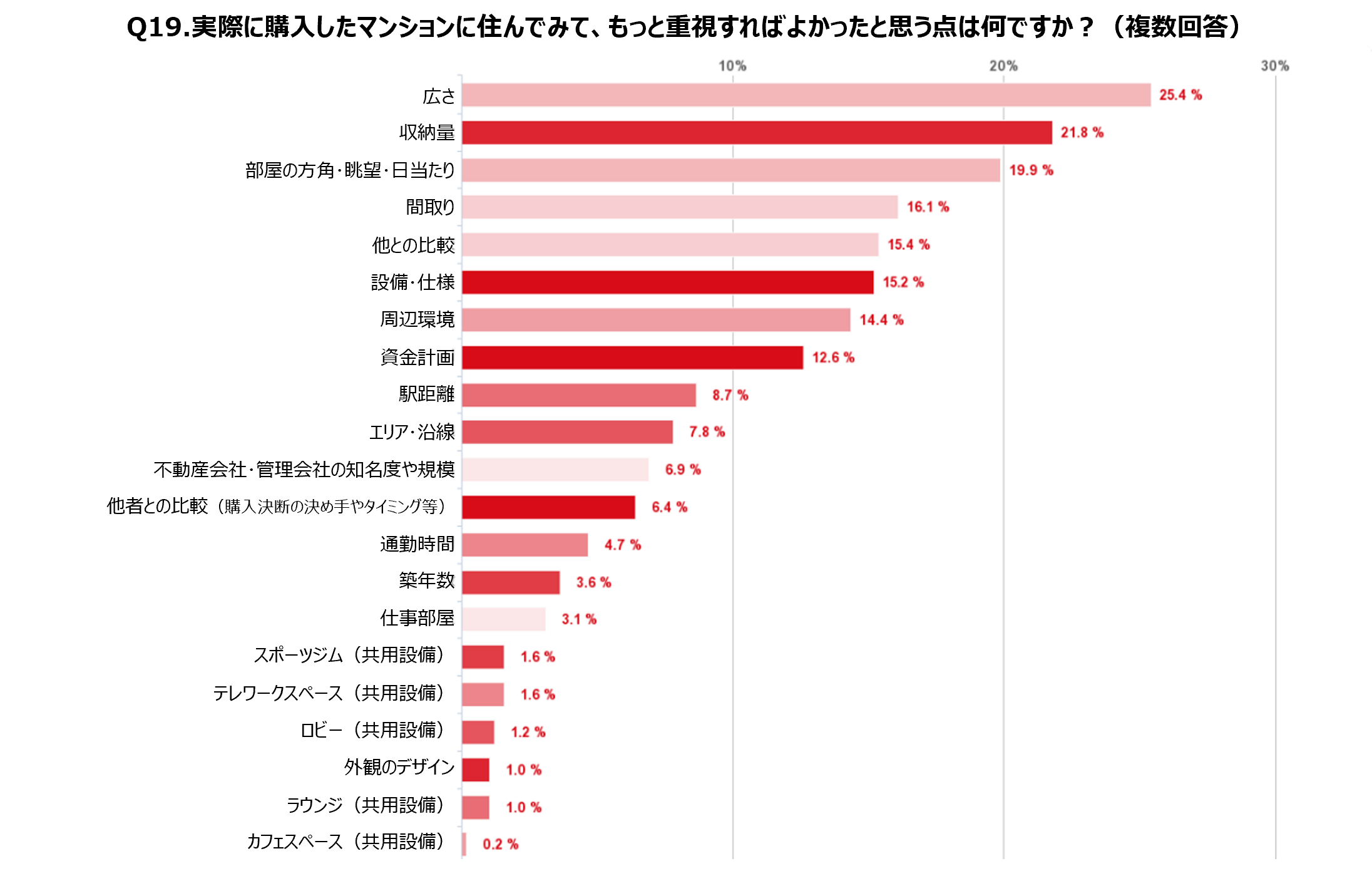 ■実際に購入したマンションに住んでみて重視すべきだと回答が多かったのが、「広さ」(25.4%)、「収納量」(21.8%)