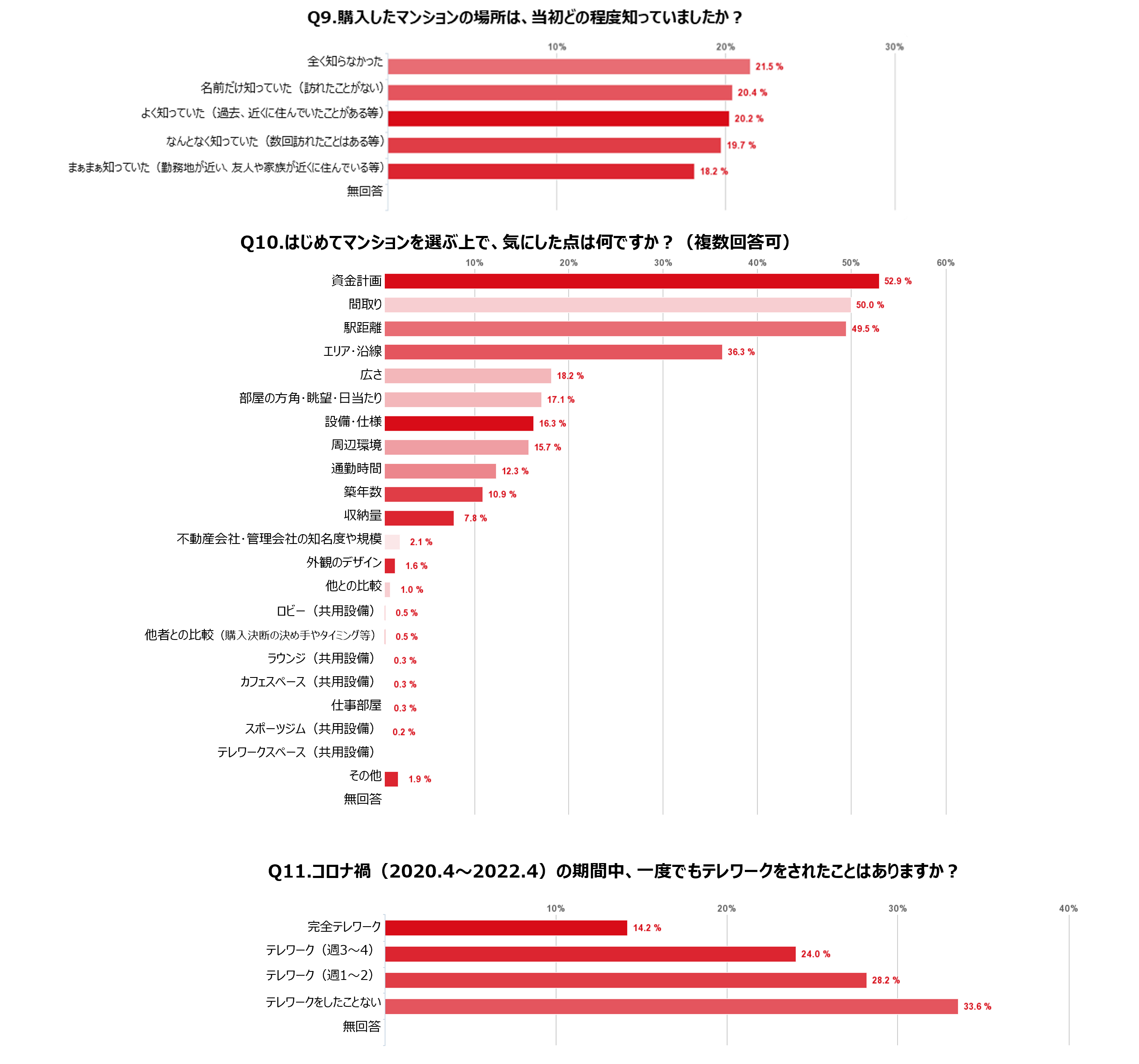 ■マンションを購入する際には、事前にその物件についてあまり知らなかったという方が4割という結果に。物件をいくつか見学し、希望条件や資産価値としての指標となる「駅距離」「エリア・沿線」「間取り」を気にして選らんでいる。その中でも前回調査で多かった「駅距離」よりも「間取り」を選ぶ方が若干上回り、「通勤時間」を意識する方も減っていることから、コロナ禍によるテレワークをする機会が増加し、多少駅からのマンション、職場との距離があっても広く住みやすいマンションを選ぶ人が増えたと考えられる。