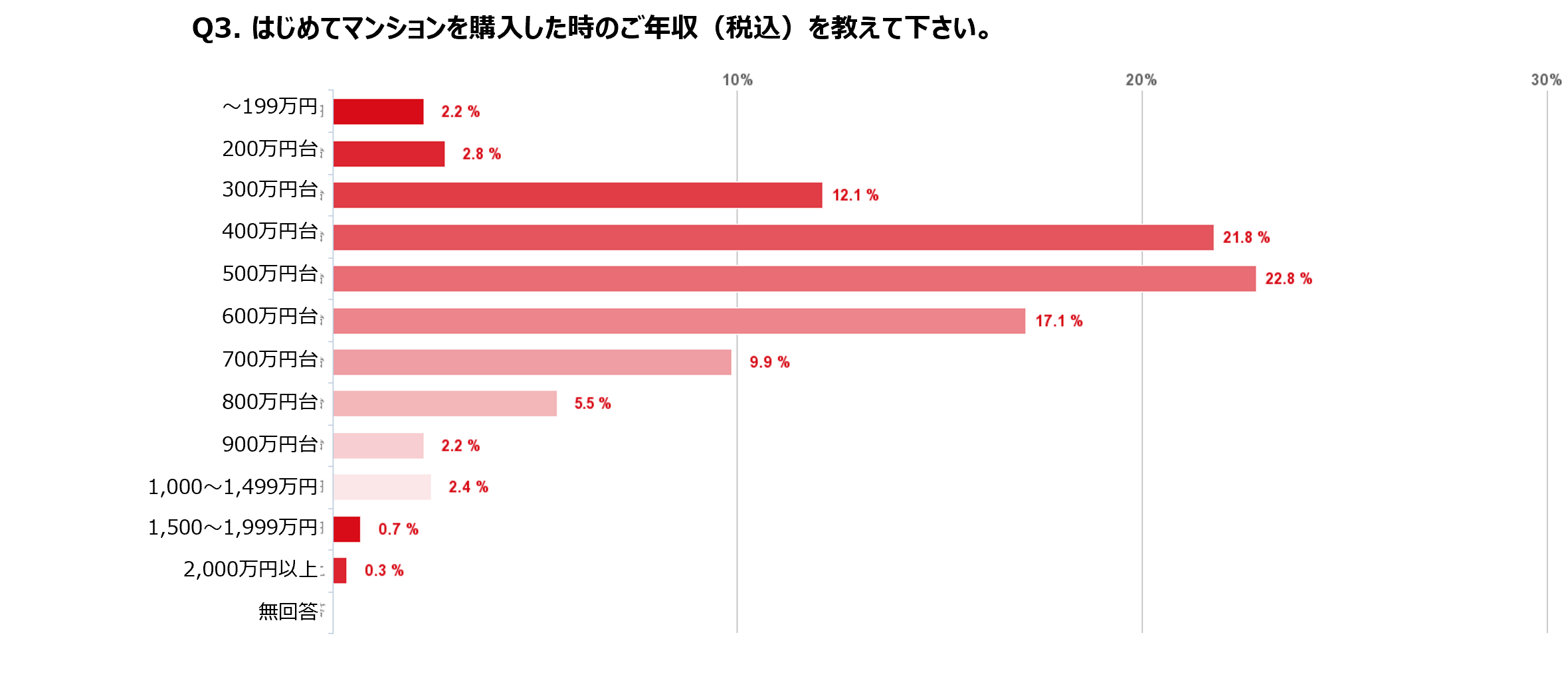 ■年収は「500万円台」がトップ。2番目に多いのが「400万円台」となるが、前回調査と比較して「600万円台」以降の購入者が多くなっている。
