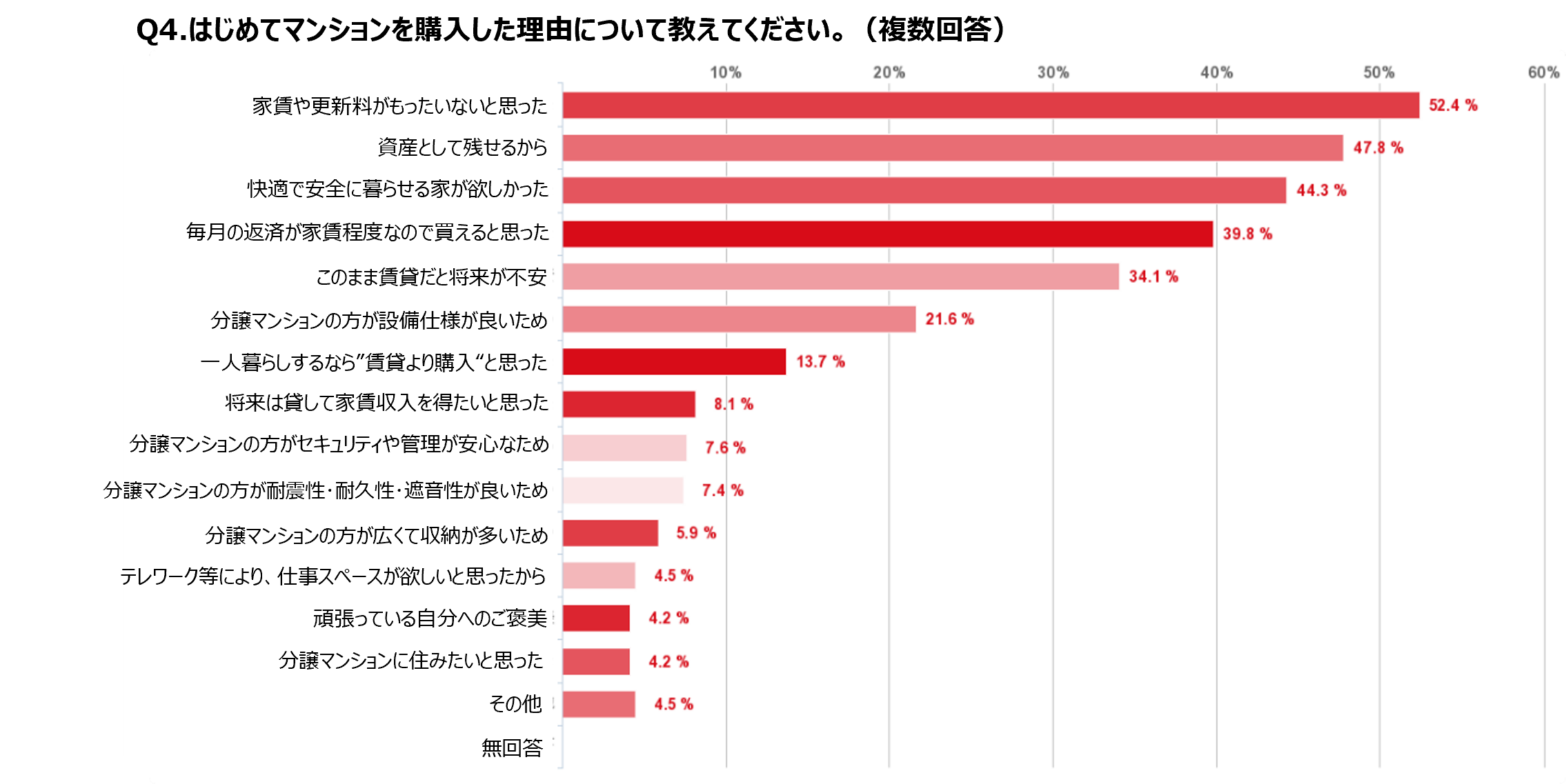 ■購入を決める理由として、「(賃貸物件の)家賃や更新料がもったいないと思った」こと(52.4%)が一番に。続いて、「資産として残せるから」(47.8%)、「快適で安全に暮らせる家がほしかった」(44.3%)となった。