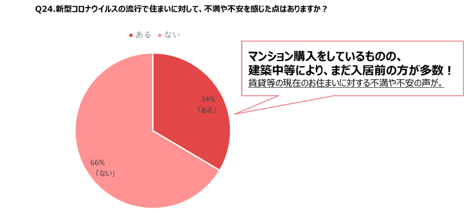 ・新型コロナウイルスの流行で今の住まいに対して「不安あり」が34%、「不安なし」が66%という結果に。