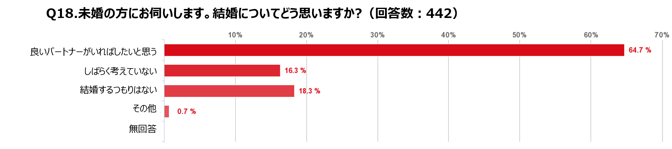 ■未婚女性の64.7%が結婚を「いいパートナーがいればしたいと思う」と前向きに回答している一方、前回調査と比較すると 10%近くダウン。結婚やライフスタイルに対する価値観が多様化していることがわかった。