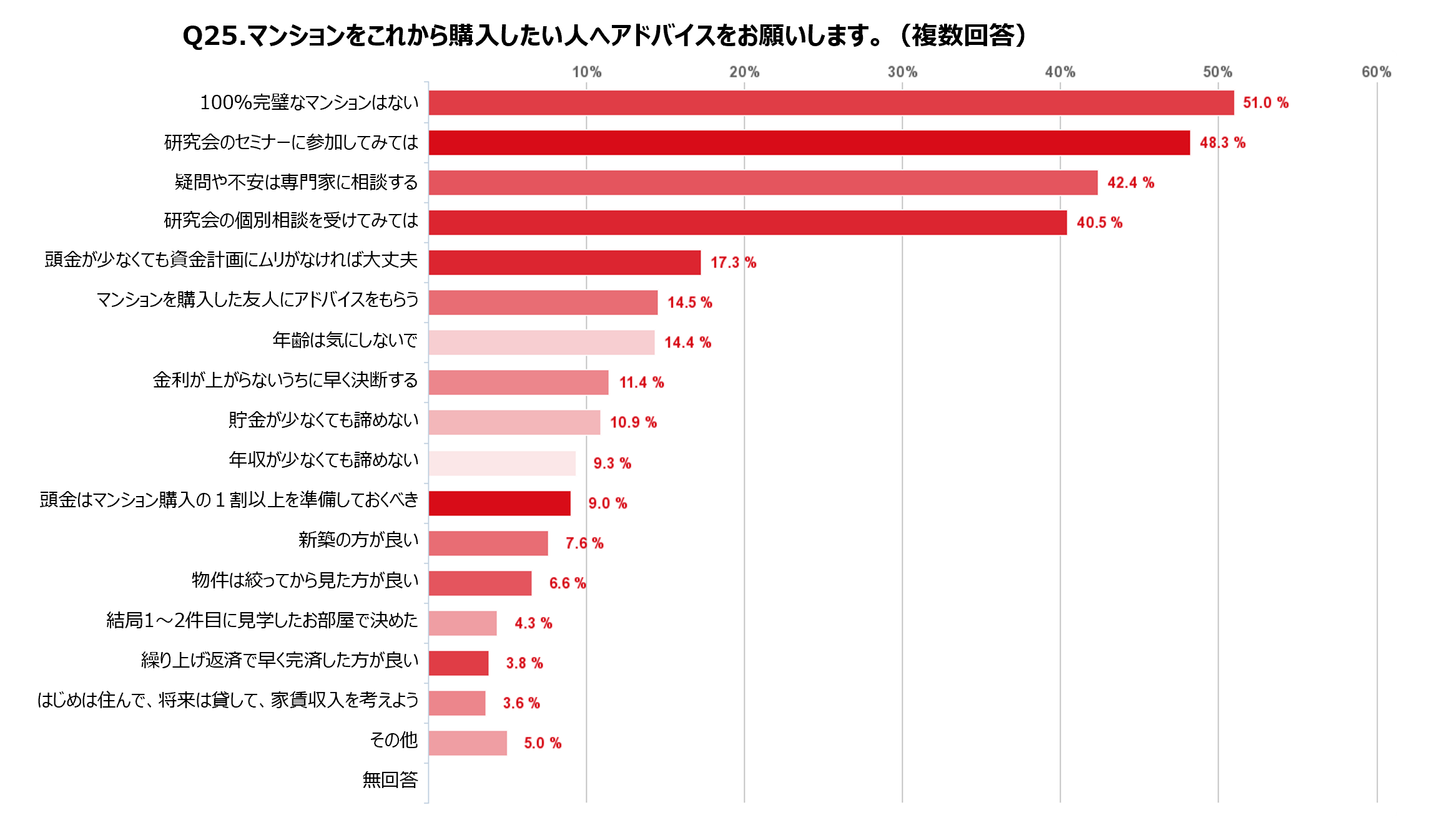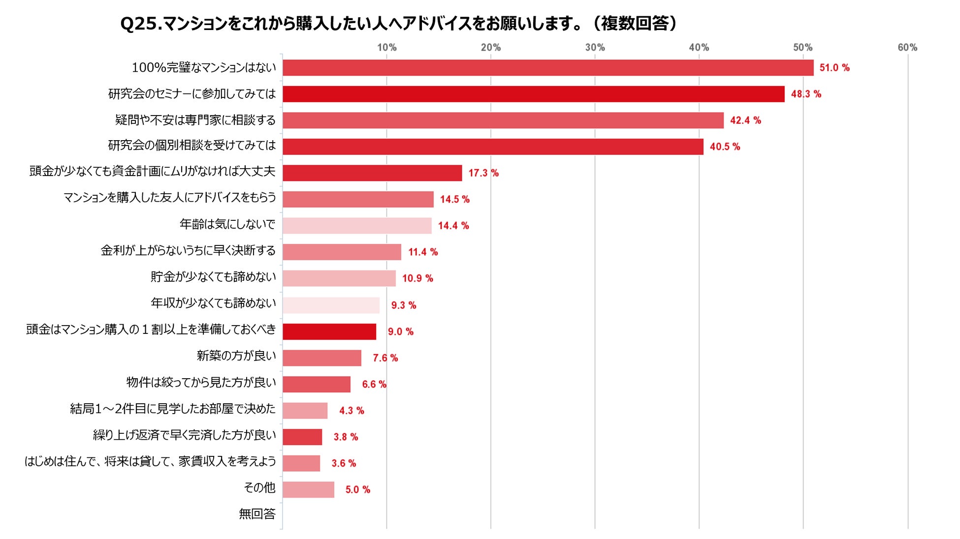 一番多かったアドバイスは、 「100%完璧なマンションはない」 。だからこそ、セミナーへの参加や専門家への個別相談で疑問や不安をしっかりと解決することを勧める声も目立つ結果に。そのほかにも、「頭金が少なくても資金計画にムリがなければ大丈夫」「年収が少なくても諦めない」といった資金にまつわる具体的なアドバイスが上がった。