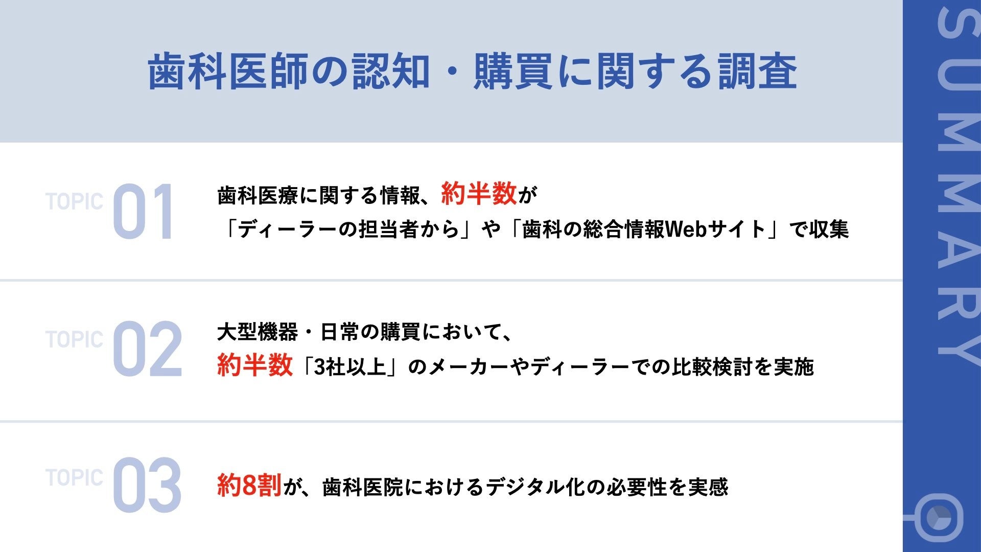 今回の調査では、歯科医師が忙しい業務の中で、ディーラー担当者や専門サイトから、日々アップデートされている情報を仕入れていることがわかりました。大型機材を購入する際に限らず、日常の購買においても、数社のディーラー、数社のメーカーにて比較されている事が伺え、機器や医材料の競争も激しくなっているようです。また今後、受発注に限らず、医師の手間を省くためのデジタルサービスが、積極的に導入されることが予想されます。医療機器メーカー、医材料メーカーとしては、ディーラーやWebでの情報発信、そして、デジタルでのサービス強化に期待が寄せられていると言えるのではないでしょうか。