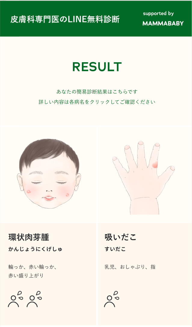 皮膚科専門医協力のもと国内最大※となる110以上の症例の情報を備えた、子どもの皮膚疾患に特化したチャットボット無料診断です。