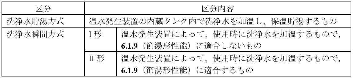 1.種類(箇条4)について、洗浄水加温方式による区分の瞬間方式において、省エネ性能の適切な評価のため、節湯形か否かによるクラス分けを追加するほか、便座加温方式による区分を追加する。