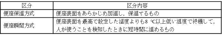 ・暖房便座性能について、便座加温方式の区分の追加に伴い、区分ごとの規定値を定める(箇条6.3)。