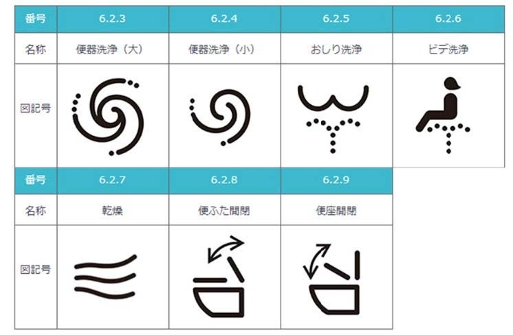 便器・温水洗浄便座に関連する図記号(ピクトグラム)が,2018年1月にISO 7000(Graphical symbols for use on equipment - Registered symbols)に,同年12月にJIS S 0103(消費者用図記号)に規定されたことに伴い,操作パネルの図記号の普及を受け,操作表示の規定として操作パネルの図記号(ピクトグラム)はJIS S 0103によることを新たに規定しました。