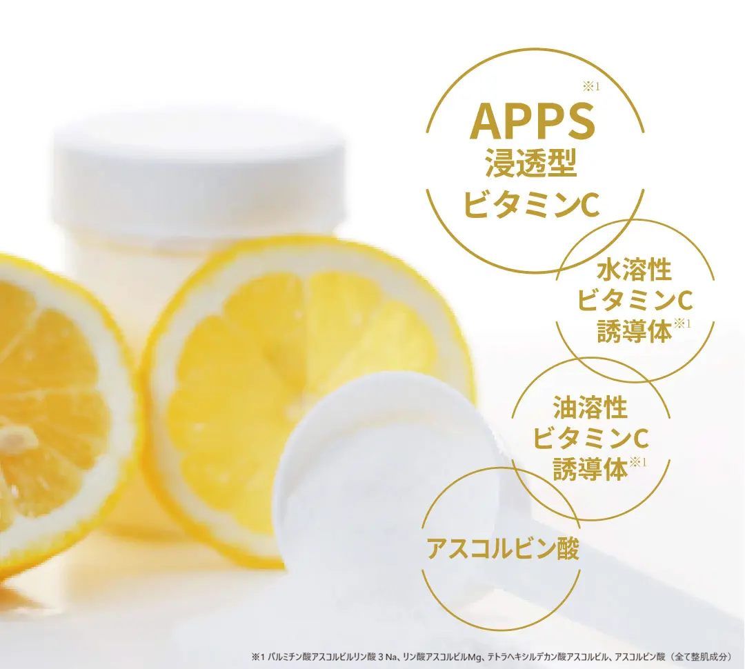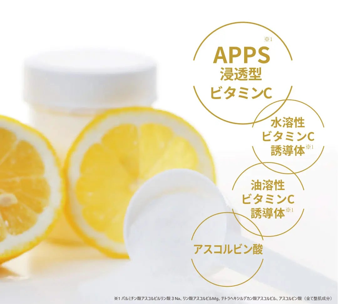 角質層への浸透*⁷性を格段に高めたビタミンCの理想型とも言えるAPPS*¹⁰(浸透型ビタミンC誘導体)、水溶性ビタミンC誘導体*¹¹、油溶性ビタミンC誘導体*¹²、アスコルビン酸*¹³の4種のビタミンCを高濃度*⁵で配合。それぞれのビタミンCの特性を活かし、時間差で肌のすみずみまで働きかけます。