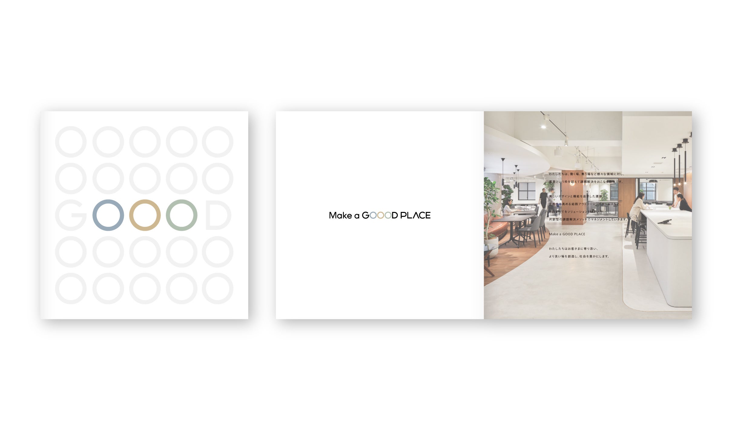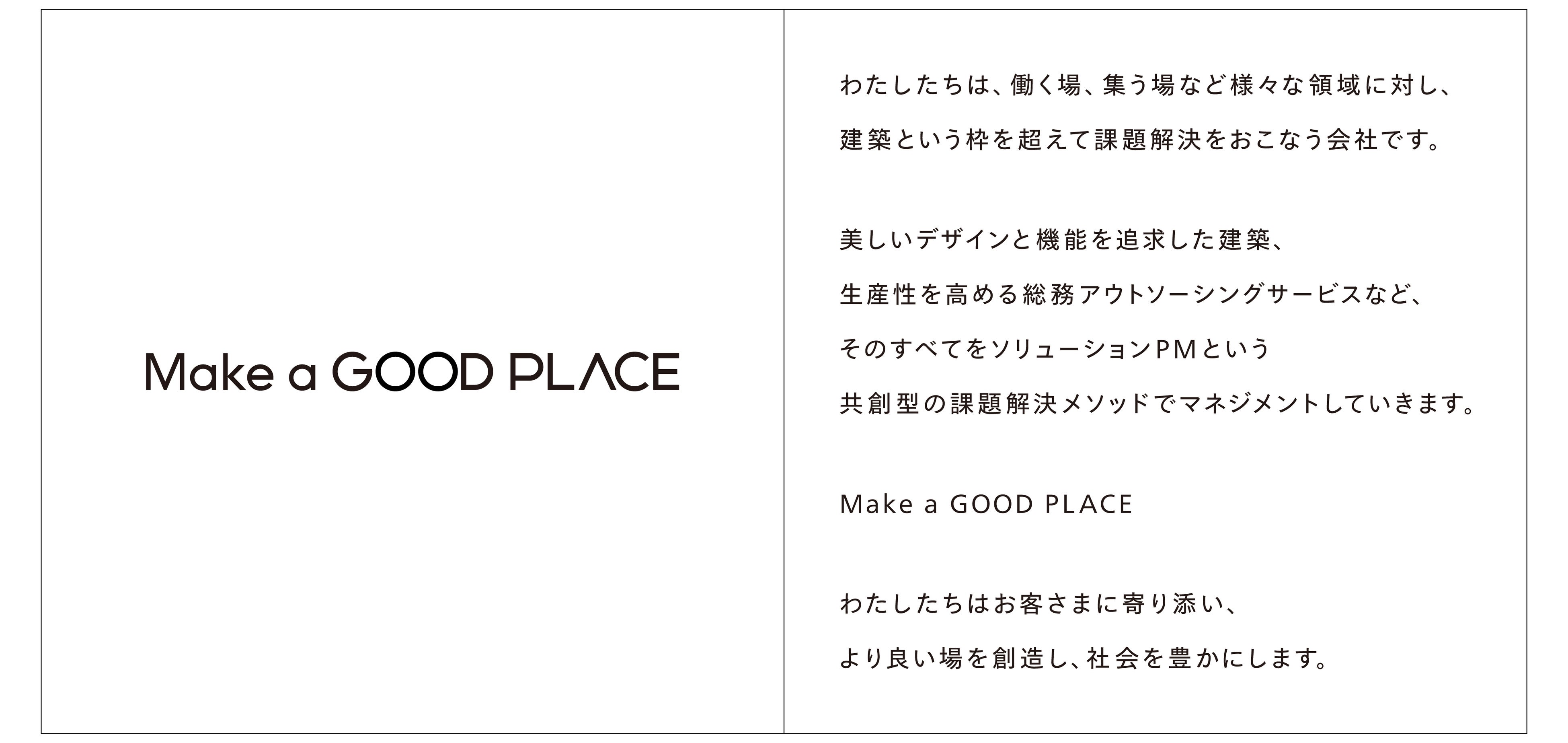企業活動全体に一貫した軸をつくるブランドコンセプトとして「Make a GOOD PLACE」を策定。コーポレートネーミングは、建築のみ ならず働く場や環境を創造する「良い場をつくる」サービスを体現し、主軸の3事業を打ち出す「GOOD PLACE」を開発しました。