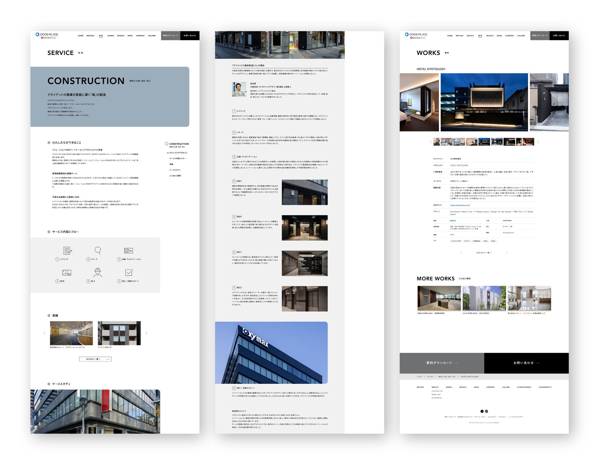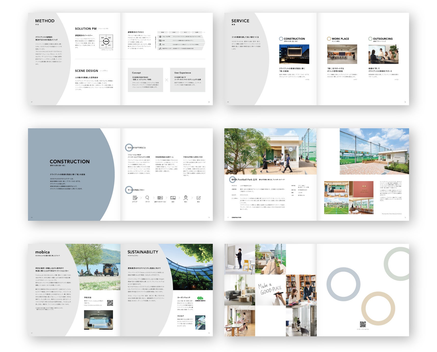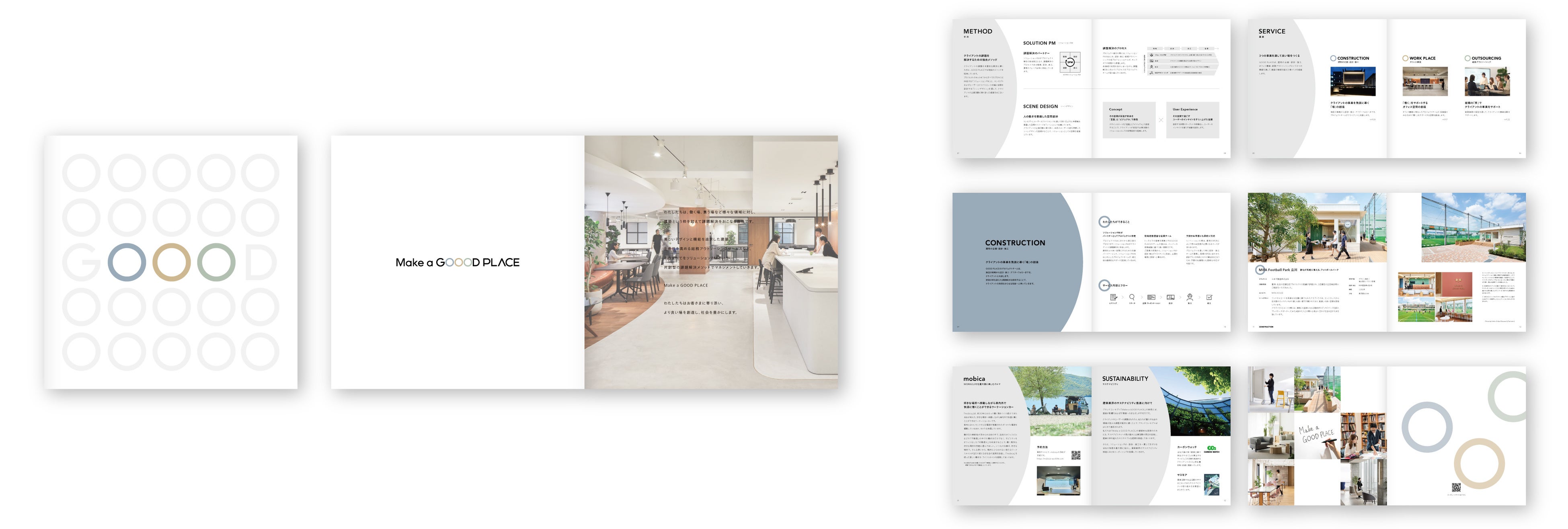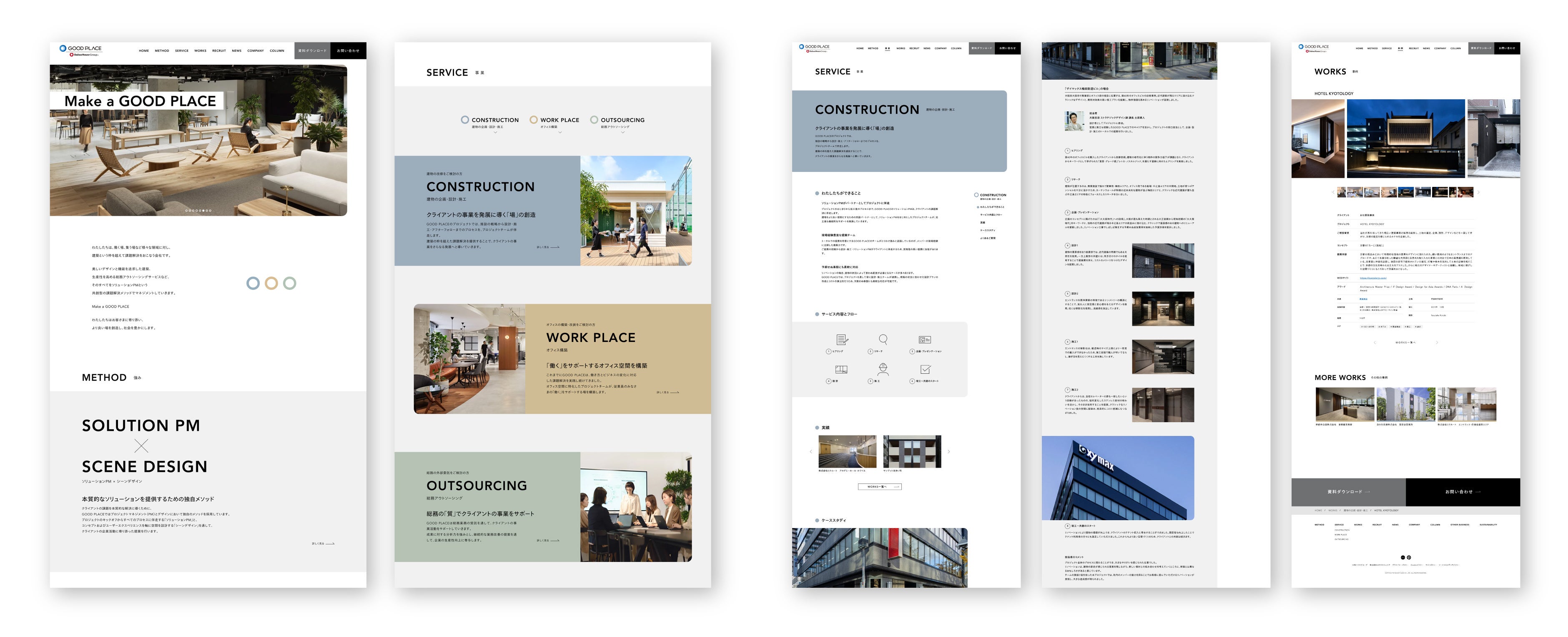 GOOD PLACEは、建物の企画・設計・施工、オフィス構築から、総務業務の受託を行う総務アウトソーシングサービスを通じて建築の枠を超えてさまざまな場の課題解決を行う会社です。今回のブランディングでは、戦略からコンセプト・ネーミング開発、ロゴやWEB、パンフレットのコミュニケーションデザインだけではなく、GOOD PLACE独自の課題解決メソッドの開発や、仕事の上流から参画する「ソリューションPM」の実装、ブランド強化を推進していくブランドマネジメント課のコンサルティング、デザイン力強化としての設計組織の「室長制」の導入及びコンサルティングでリブランディング全般に伴走しました。