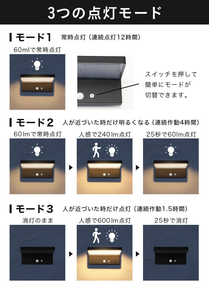 点灯モードは3種類。スイッチひとつで簡単にモードを切り替えられます。