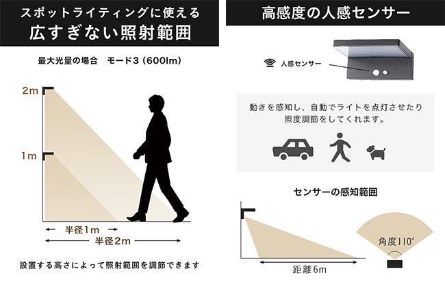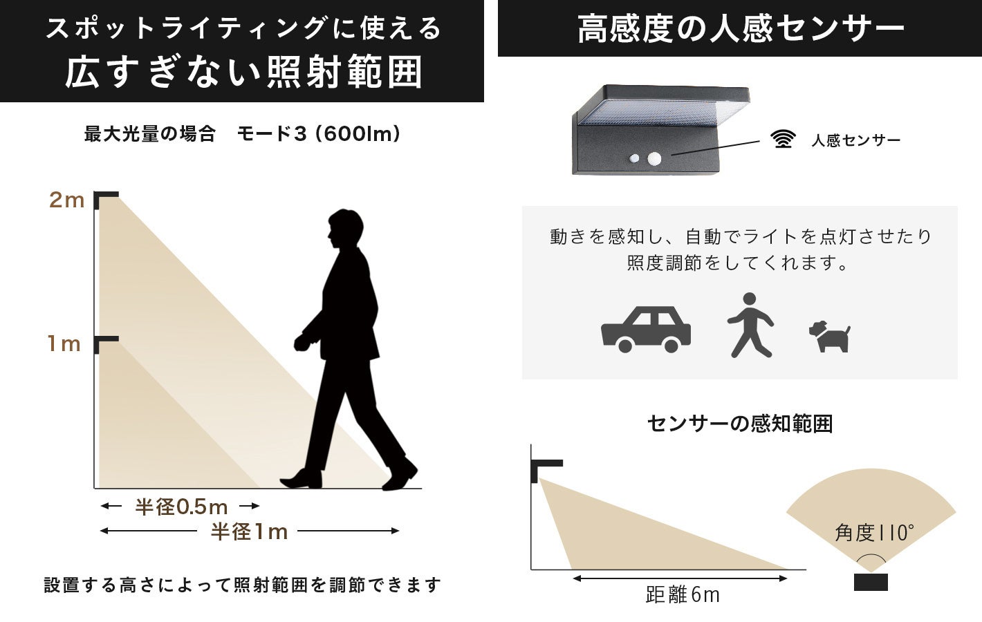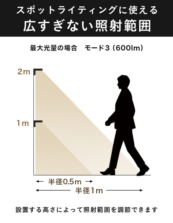 設置する高さで照射範囲が変化します。足元をしっかりと照らすときは腰の高さ、広く全体を照らしたいときは頭上にと用途によって変えられます。また、人感センサーの感知距離はなんと6m。遠くからの動きも感知してくれます。