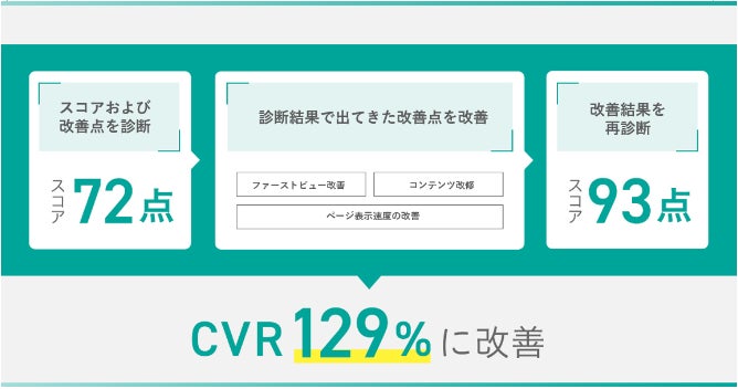 診断結果に基づいて、ファーストビューの改善、ライティングページ内のコンテンツ改修、ページ表示速度の改善などを行い、CVR(コンバージョン率)が129% に改善。