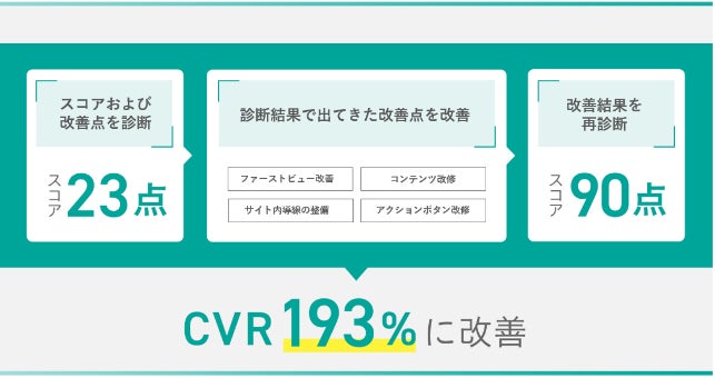 診断結果に基づいて、ファーストビューの改善、ライティングページ内のコンテンツ改修、サイト内導線の整備、アクションボタンの改修などを行い、CVR(コンバージョン率)が193 %に改善。