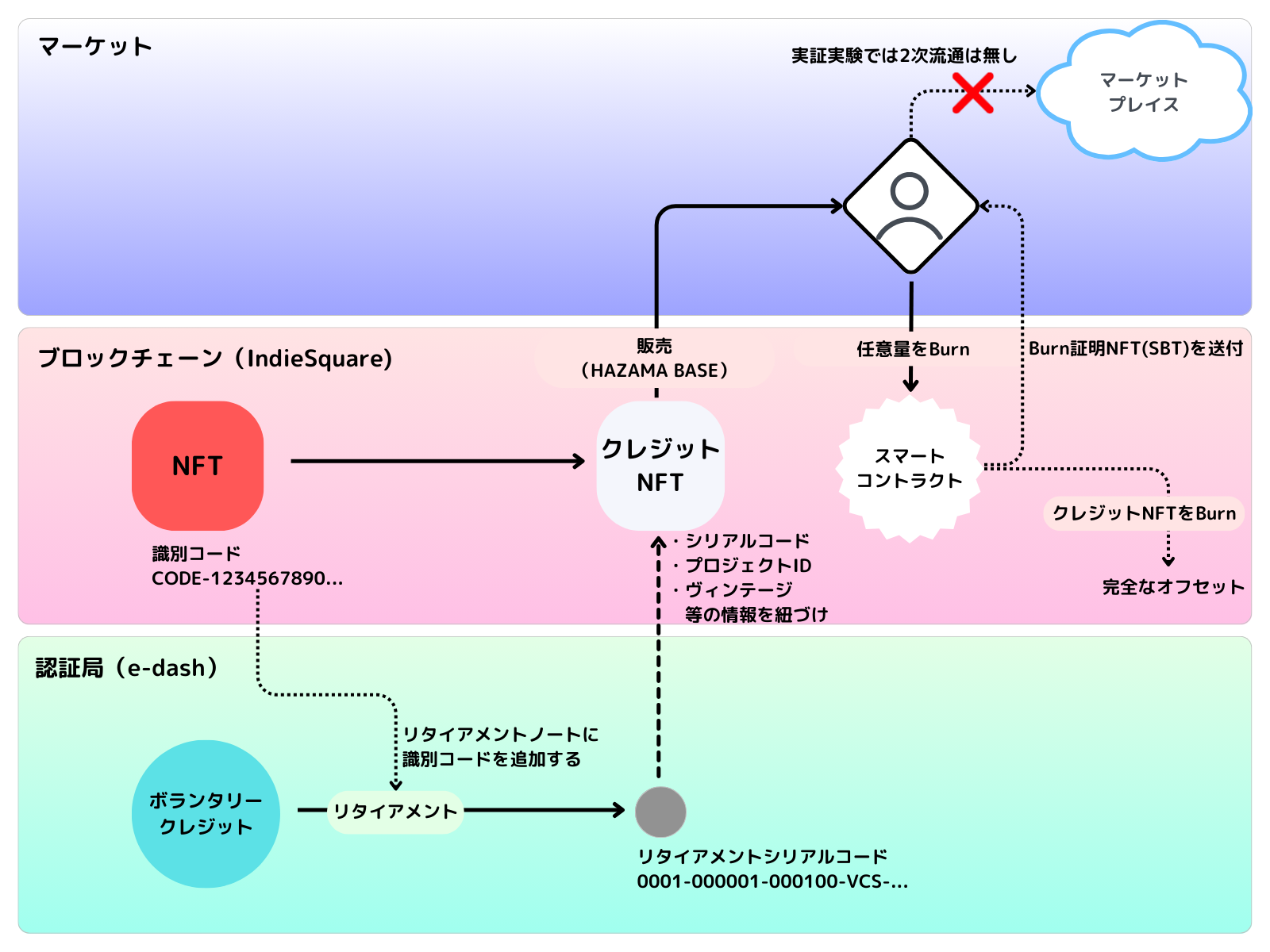 本実証では、e-dash社の提供する「e-dash Carbon Offset」から選別されたボランタリークレジットを当社が提供するノーコードweb3プラットフォーム「HAZAMA BASE」で「1st-Off」と名付けられたトークンとしてNFT化し顧客へ販売します。さらに顧客自らがそれをBurn(償却)可能な環境をセットで提供することで、カーボンオフセットを⼿間なく半永久的にブロックチェーンへ刻み、透明性の⾼い状態でその証明を⾏うことを、本実証を通じ確認します。