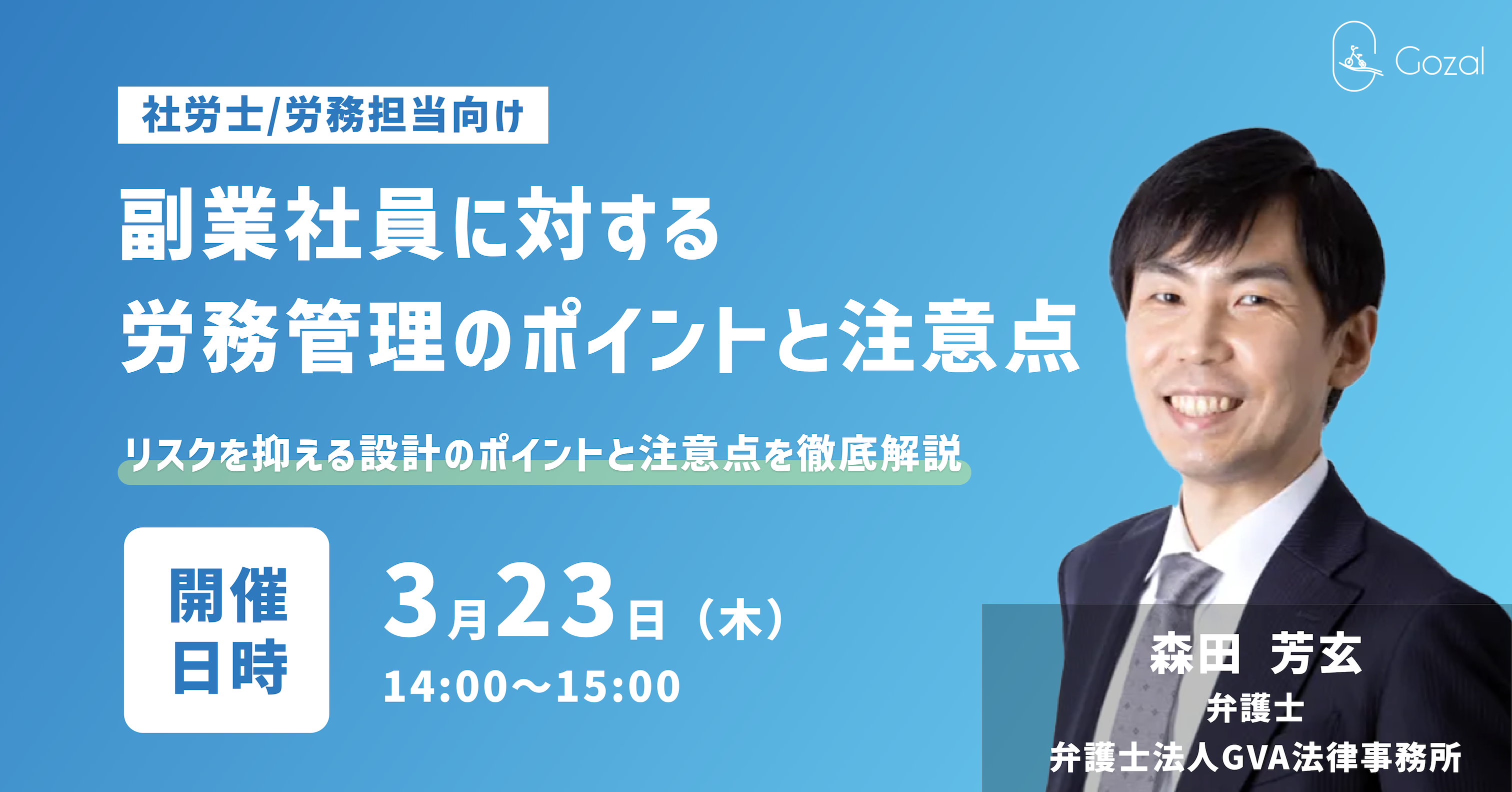 クラウド型給与計算チェックソフト「Gozal(ゴザル)」を運営する株式会社Gozal(本社:東京都目黒区、代表取締役:髙谷 元悠)は、「副業社員に対する労務管理のポイントと注意点」について2023年3月23日(木)14時~弁護士法人GVA法律事務所(東京都渋谷区、代表弁護士: 山本 俊)とオンラインウェビナーを共催いたします。