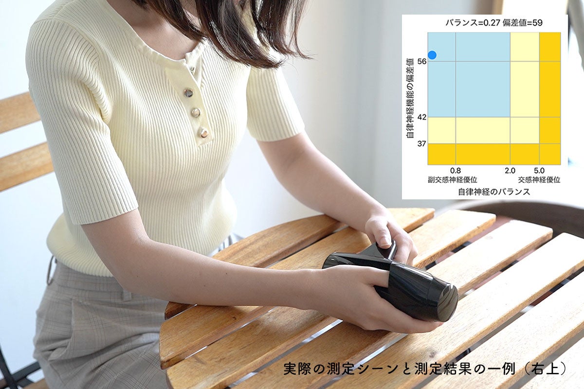心拍変動で「疲労」を測定。バイタルデータによる自律神経数値化とビックデータの分析により、自律神経のバランスと偏差値を示し、これまで客観的な評価が難しかった「疲労・ストレス度」を可視化する機器。