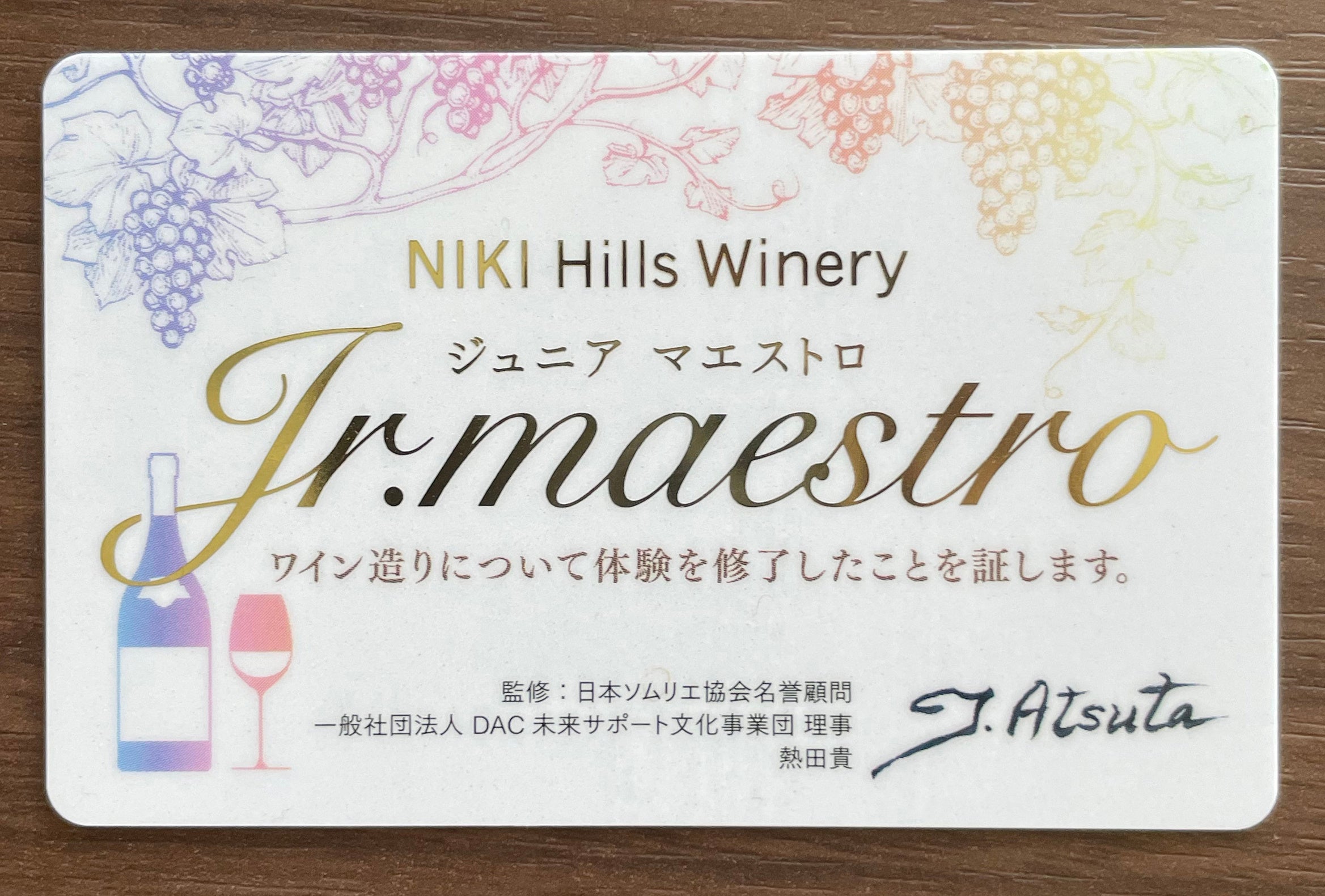 子どもたちにワイン造りの体験を修了したことを証明する、オリジナルの「ジュニアマエストロ修了証」が同ワイナリー総支配人の舟津より手渡しされました。子どもたちがエチケット(ラベル)に10年後、20歳の自分に宛てたメッセージを書いた「マイボトル」はNIKI Hills Wineryで保管されます。