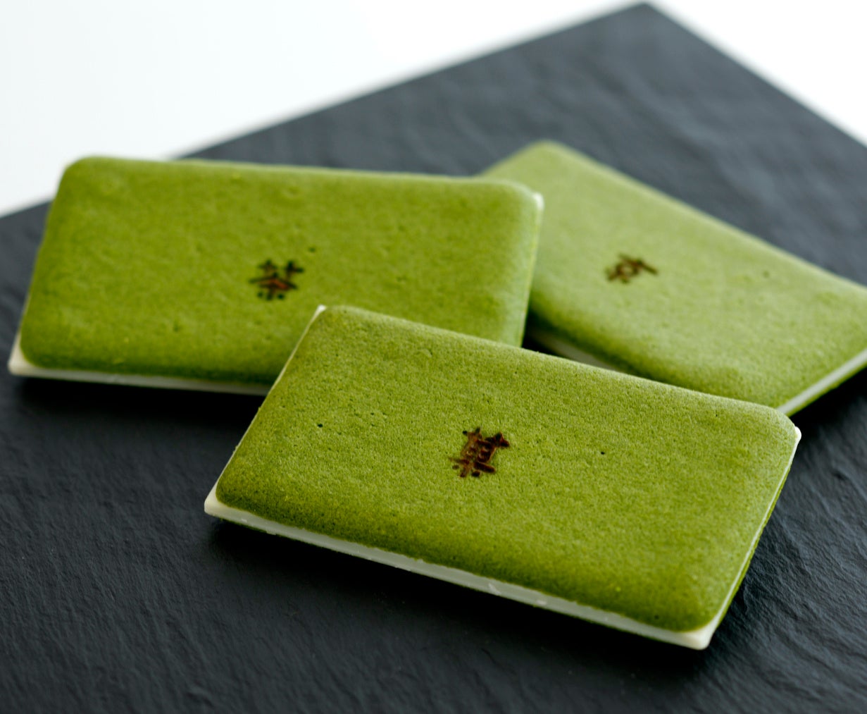 京都 宇治 白川の厳選茶葉をはじめとする宇治茶を使用。色・味・香りを極めたお濃茶を、シェフの技と五感で繊細な口どけのラングドシャに。