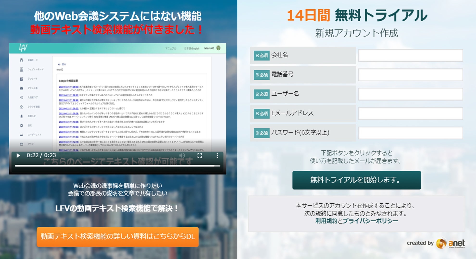 エイネット株式会社(東京都千代田区神田佐久間町3-23 スタウトビル3F 代表取締役 西畑博功)は、相手に会議名を伝えるだけで、すぐに利用が開始できるマルチデバイス対応のWeb会議システム「LiteFreshVoice」(ライトフレッシュボイス)に、動画テキスト検索機能を搭載した新バージョンの供用を6月1日より開始いたします。