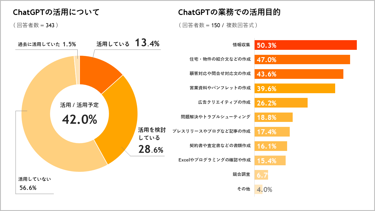 ◆ 業務でChatGPTを「活⽤している」のは13.4%、「活用を検討している」は28.6%、利⽤者は「情報収集」「住宅・物件の紹介⽂などの作成」「顧客対応や対応⽂の作成」などに活⽤