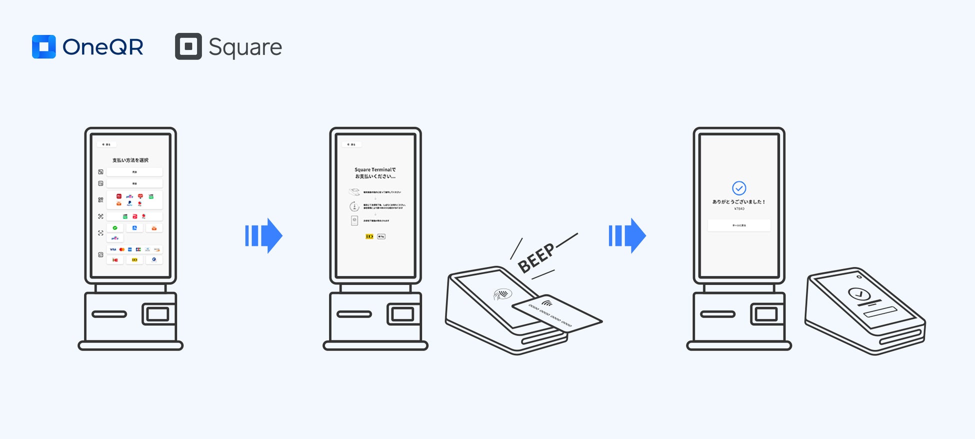 この度、Squareとのソリューションパートナーシップを通してあらたな連携を行うことで、OneQRのセルフオーダー(Kiosk端末)からの注文や、導入店舗側スタッフが利用するOneQR POS(iOS/Androidアプリ)からのご注文時、会計時にお支払い方法として、クレジットカード、電子マネー、交通系ICを選択した際に、自動的に支払い金額を入力された「Square ターミナル」の決済画面が表示されます。
