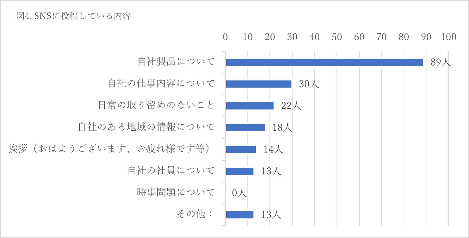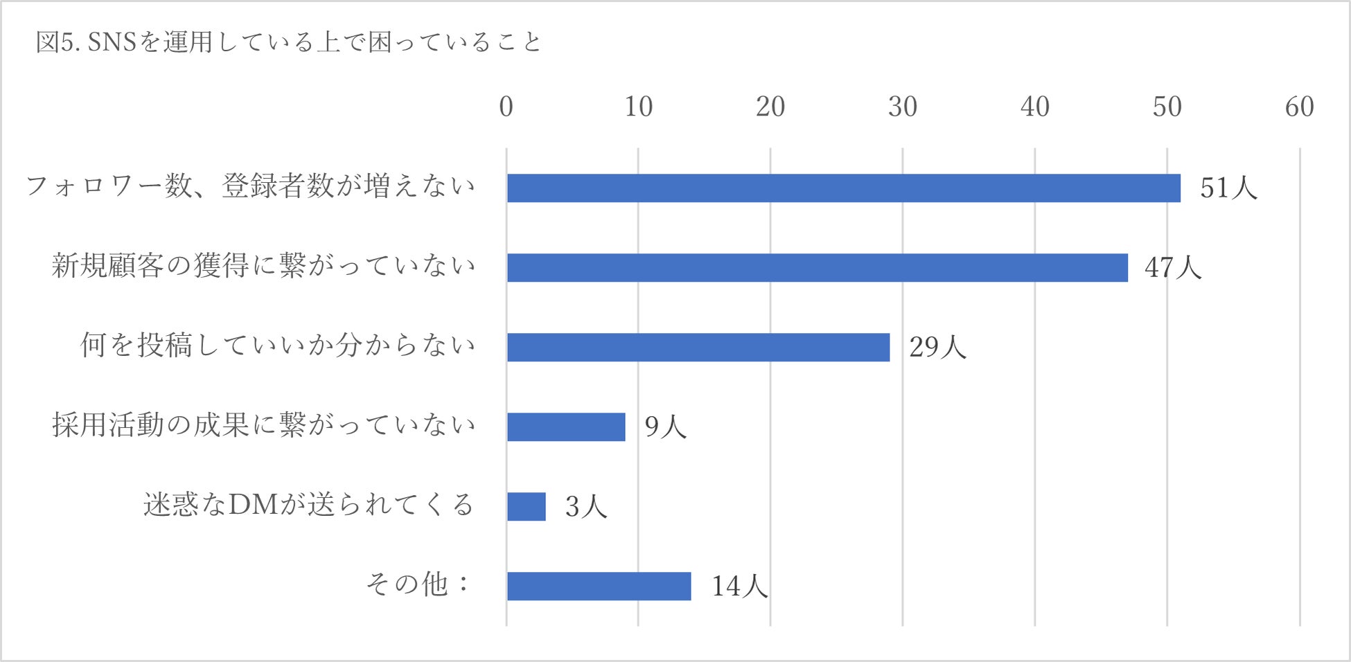 SNSには自社製品について投稿されることが最も多いという結果になりました。その一方でフォロワー数や登録者数の伸び悩みや新規顧客獲得に繋がっていない、何を投稿していいか分からないという悩みもあり、担当者が試行錯誤しながらSNSを運用していることがうかがえます。