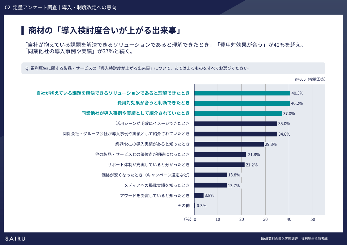 商材の「導入検討度合いが上がる出来事」について聞いたところ、「自社が抱えている課題を解決できるソリューションであると理解できたとき」(40.3%)、「費用対効果が合うと判断できたとき」(40.2%)、「同業他社が導入事例や実績として紹介されていたとき」(37.0%)が上位となりました。