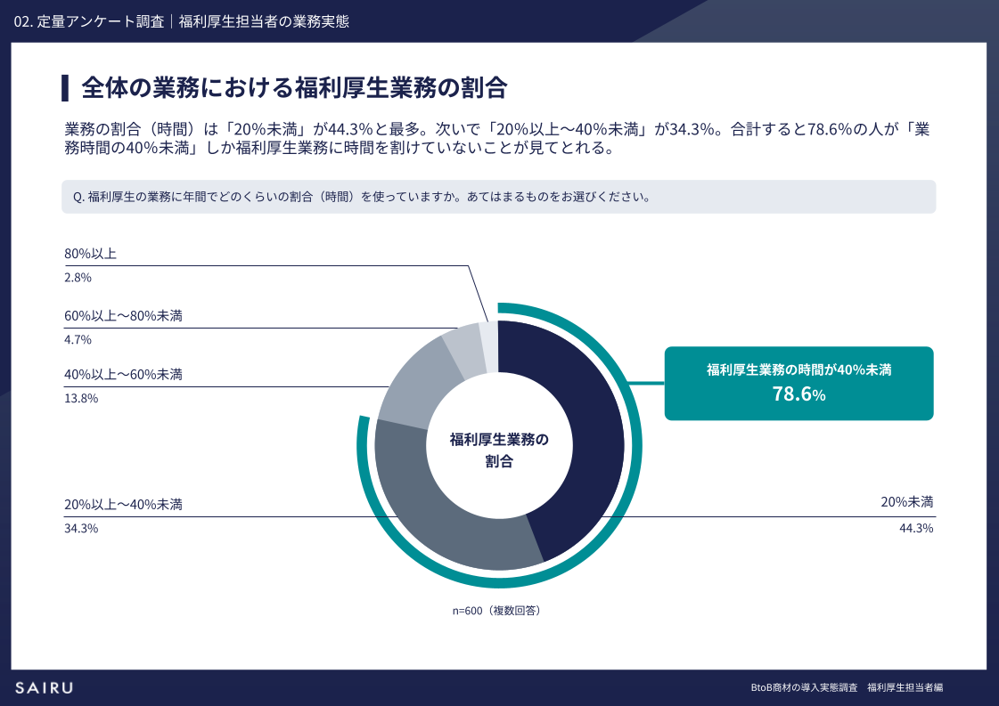 また、全体の業務における福利厚生業務の割合(時間)は「20%未満」を選択した人が最も多く、次いで「20%~40%未満」となりました。合計すると、「福利厚生業務にあてる時間が全体の40%未満」の人は78.6%にのぼります。