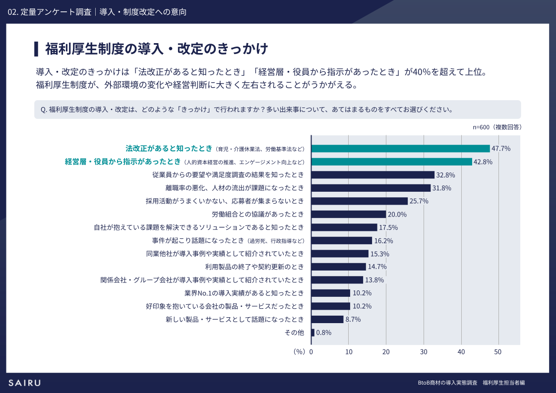最も多かったのは「法改正があると知ったとき」(47.7%)、次いで「経営層・役員から指示があったとき」(42.8%)となりました。福利厚生制度は外部環境の変化や経営判断に大きく左右されることがうかがえます。これらのタイミングで自社の商材を認知・想起してもらうことが重要です。